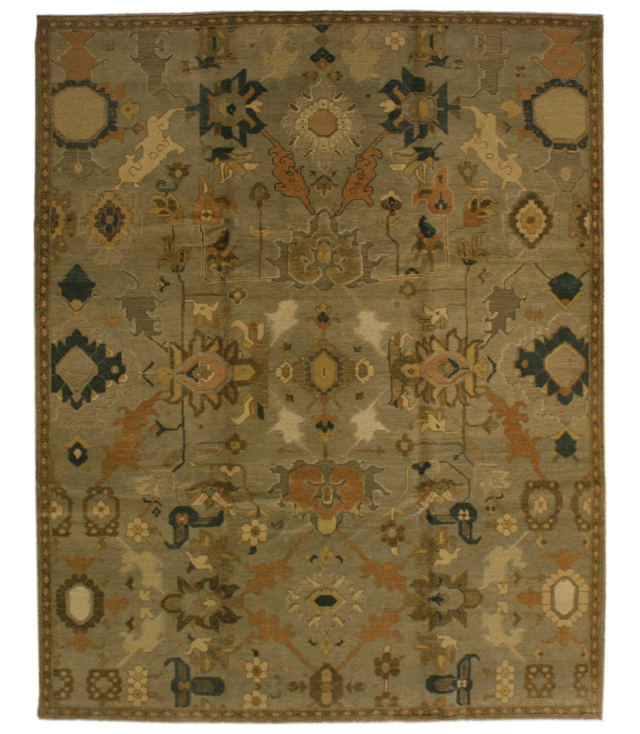 A folk inspired Armenian 100% wool rug in grey taupe. Rukesh with Soumakh #219 was handcrafted in Armenia of 100% aboriginal Caucasian sheep's wool. This rug was made by Tufenkian using hand carded, hand spun and hand dyed yarns. A field of whimsical folk-inspired images barely contained by the smallest of trims, like artwork for the floors. Large and small details make this a carpet where you will discover new things every time you look at it. The background color of sample Rukesh with Soumakh #219 is grey taupe, with accents of apricot, brown, brown taupe, moss green, tan, golden beige, and cool beige. The minimal border at the edge provides for a wonderful all over transitional pattern composed of transitional elements. The mix of rug construction techniques creates more dramatic definition in the design and an unusual textural effect.