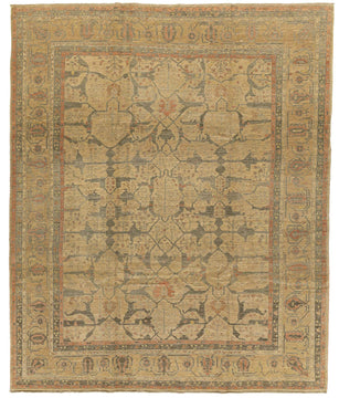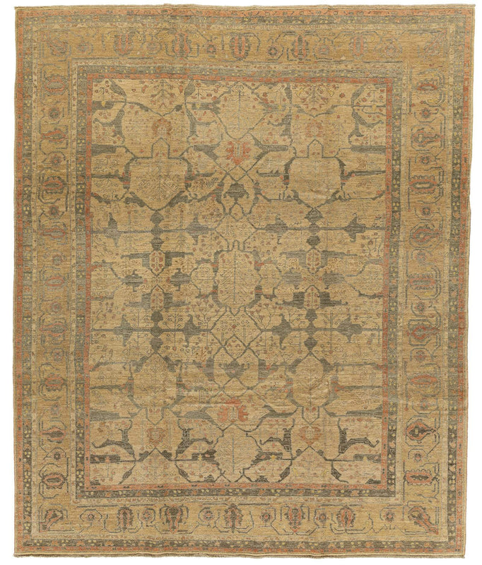 An intricately detailed traditional Armenian Tabriz weave rug. Bring elegance and tradition into your home with Mahabad, one of our most popular Armenian border rugs. Small scale detailing offers an exotic field with a subtle edge that is brought to life through warm beiege and sage green in the Sandstone colorway. This unique color sample is only available as an 8x10.