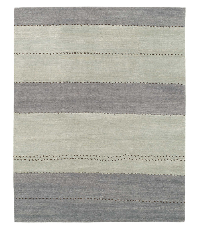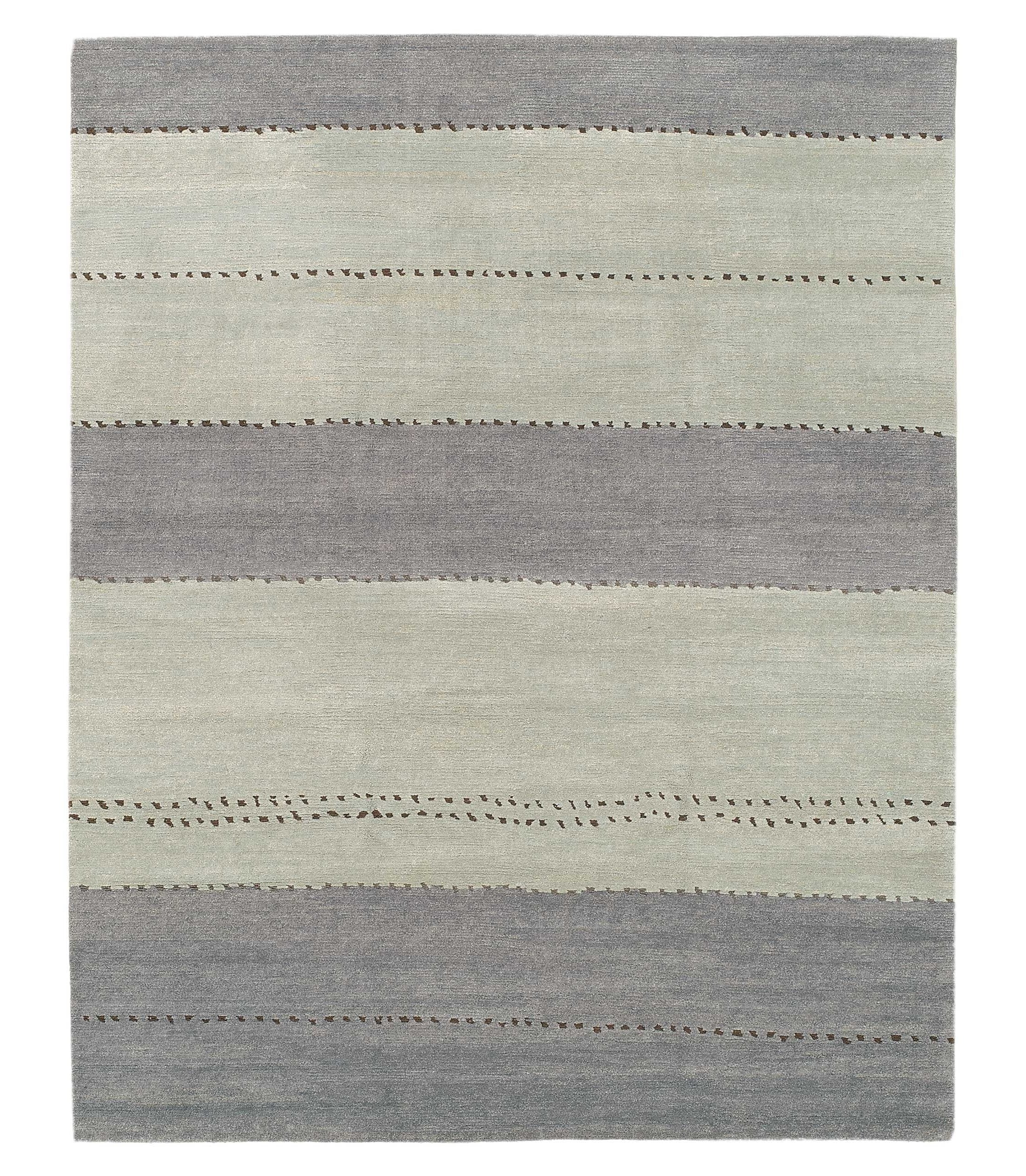 Supai Rainstone by renowned designer Clodagh is a simple yet captivating carpet. The pattern is versatile in an adaptable color palette that will ease into any interior style. Color blocking in bands of warm and cool grey tones are set off by stippled lines in earthy browns. Supai Rainstone was hand-knotted in Nepal of 100% wool using our Lama weave which has a pile height around 0.45 inches.
