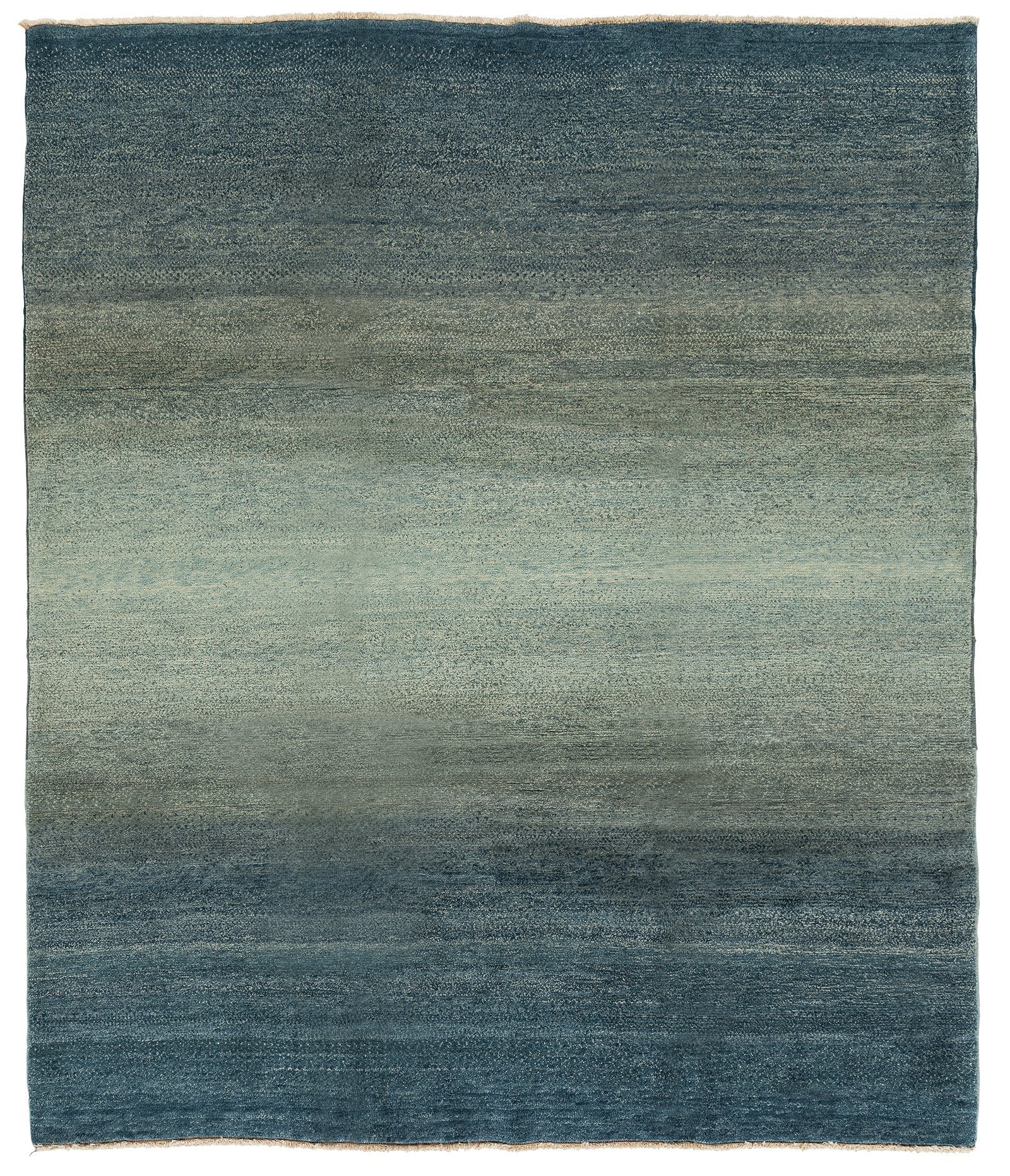 Inspired by the beauty of the ombre color transition initiated by the rising and setting of the sun and moon across the seasons of the year. With no definable pattern or design, this rug has the ability to bring very different colors together in an organic way. Consequently, the rug can safely be introduced into nearly any type of design setting for it is a truly transitional style that will find success in interiors from the very traditional to the super-modern. This one-of-a-kind colorway features a natural denim blue, brackish green and seafoam color transition.