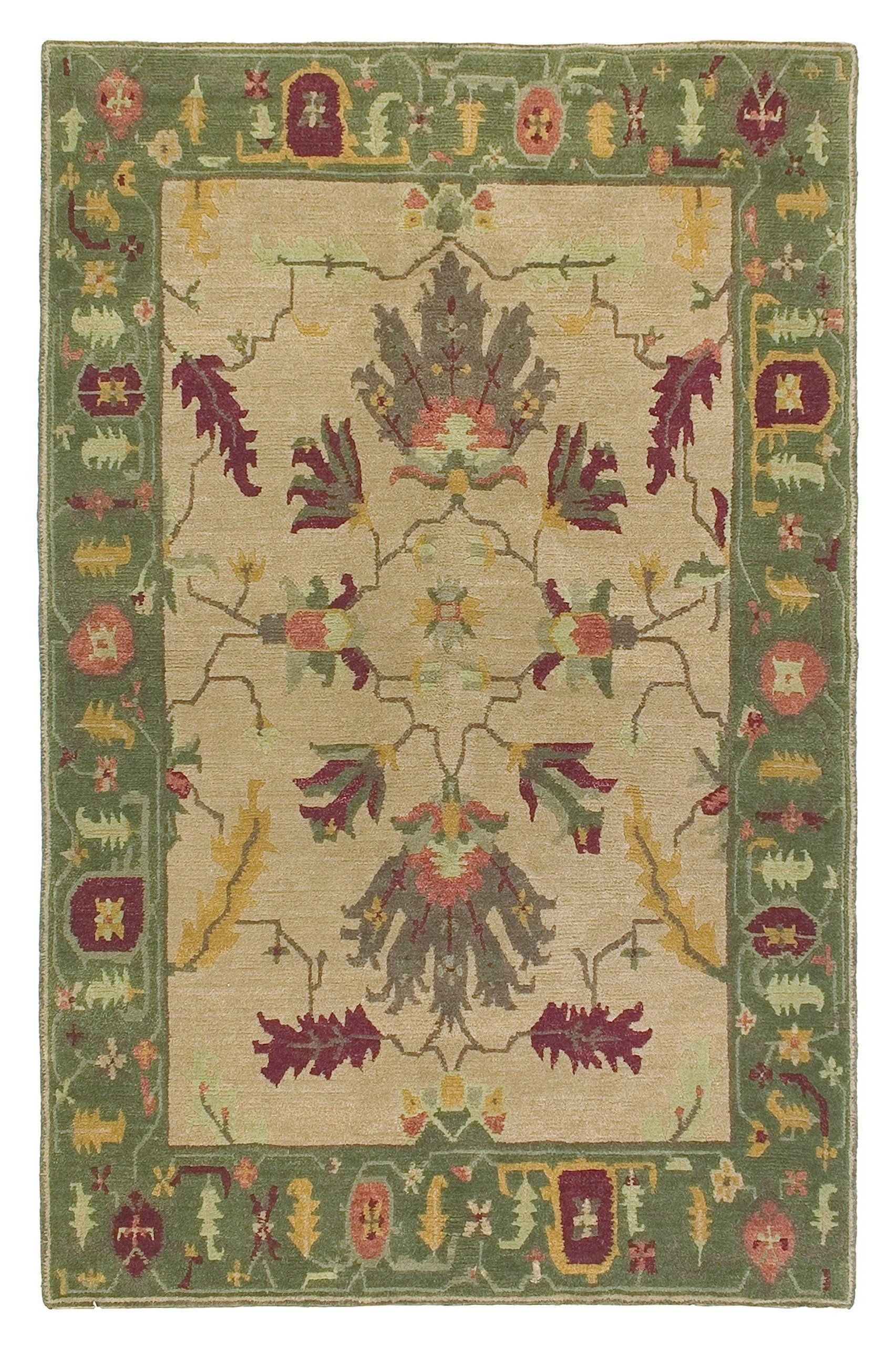 Infused with color and tribal imagery, this arts and crafts border rug will warm any room. Rich detailing hand knotted in the finest Himalayan wool. Marsovan Venetia brilliantly balances colors with a light beige field and forest green filed accented with warm colors. Marsovan Venetia can also be made to order to any size, contact your salesperson for more info on our custom program.