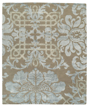 Contemporary baroque. Accessible luxury in a rich, ornate design grounded by versatile palates, elevated by the finest Himalayan wool and silk. Silvery blue silk draw attention downward in this design, a perfect contrasting color amidst the backdrop of neutral taupe and subtle accents of light, creamy beige.