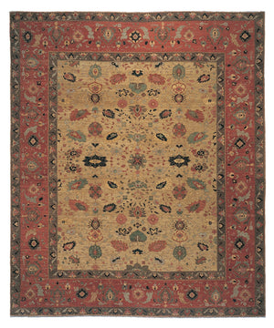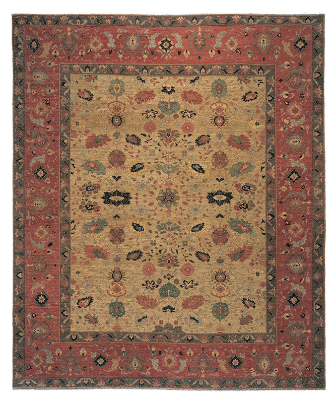 Traditional folkloric border rug with playful tribal detailing. Handmade in Armenia in fine wool. Jasmine Desert Rose has a beautiful beige field gracefully adorned with motifs and a border of dusty rose pink.