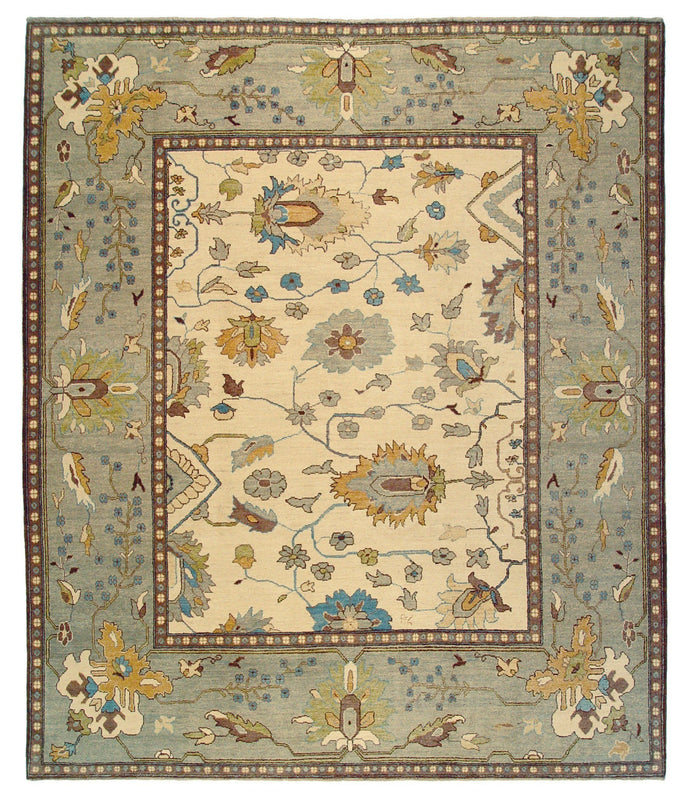 Whimsical detailing, a wide border and large and small motifs make this traditional Armenian rug a marvel to look at. Delicate vines with hopeful buds dance in the fields and borders of this handcrafted wool rug. Tashkent Eggshell Sheared has been sheared to a pile height under 1/2 of an inch.