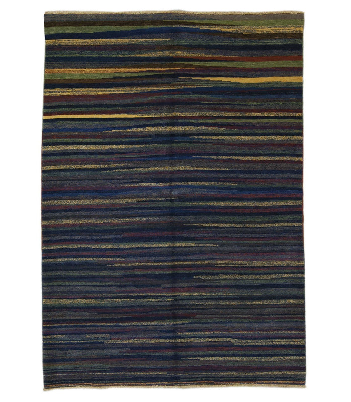 A blue and green multi colored Armenian Gabbeh style rug. The Horizon rugs are Tufenkian's version of the Iranian Gabbehs, made with a similar weave and also dyed using all natural vegetable based dyes. The Armenian Horizon rugs were handcrafted in Armenia using 100% Armenian wool which has a slightly different quality than the wool used in traditional Gabbehs made in Iran. Unlike any of our other processes these rugs use inspirations created by the weavers themselves giving them a truly unique and one of a kind quality. This Armenian Horizon rug uses a primarily blue and green palette with golden yellow, brown and red woven into the striation pattern.