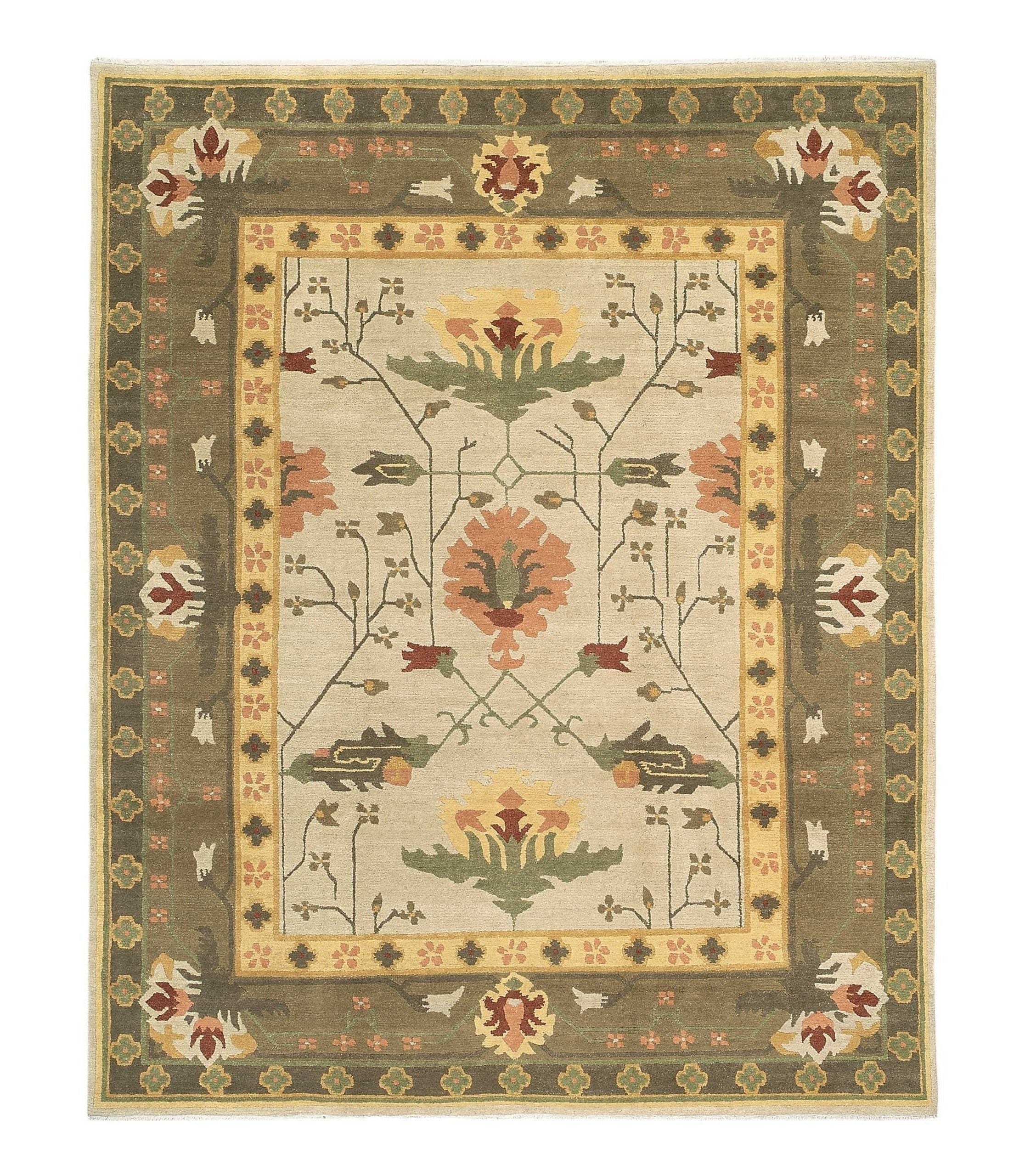 A traditional 100% wool beige and green Setana weave rug. Fine detailing and a highly layered narrative, Big Donegal is one of our most popular Arts and Crafts border rugs. Charming, artful motifs are delicately rendered in the finest Tibetean wool.