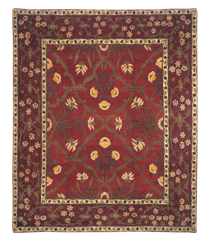 This lush, botanical study offers an exotic look into the perfection of nature. Shahjahan Ruby's absolute symmetry is an art form unto itself, fulfilled in a ruby red field and muted red border with green and golden accents. Artfully crated in Nepal of fine Himalayan wool and constructed with Tufenkian's Shakti quality weave. The pile height of this rug is around 0.28 inches. Shahjahan Ruby is available in a variety of sizes and would accentuate both traditional and elegant decor, a perfect rug for a foyer, transition areas, master bathroom, dining room or home office.