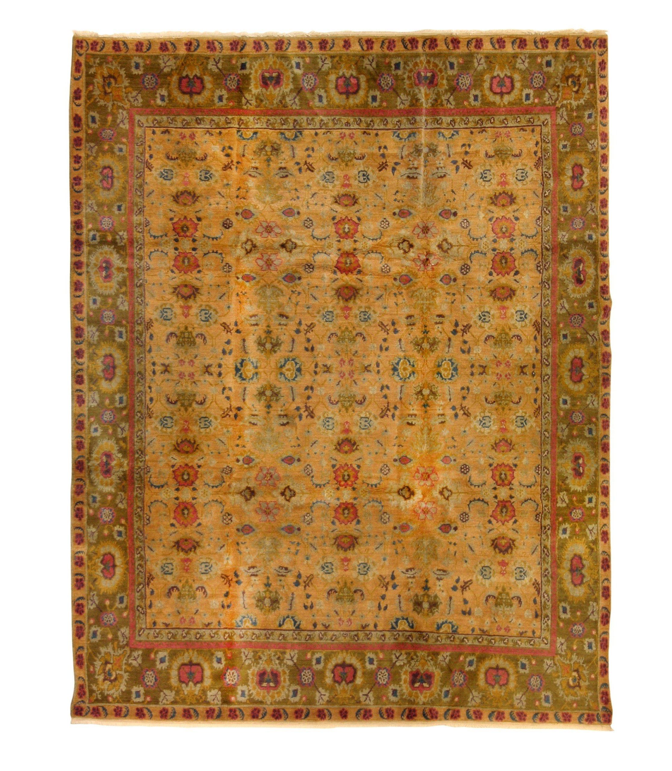A traditional rug adorned with a densely patterned caramel field that recedes in an environment instead of overpowering the space. Perfect for traditional environments, but also great in minimal settings bringing a bit of the unexpected without breaking the peacefulness of the setting. Hand-knotted in Nepal of fine Himalayan wool with a high quality weave, this artful traditional rug would be perfect for a dining room, bedroom or living room.