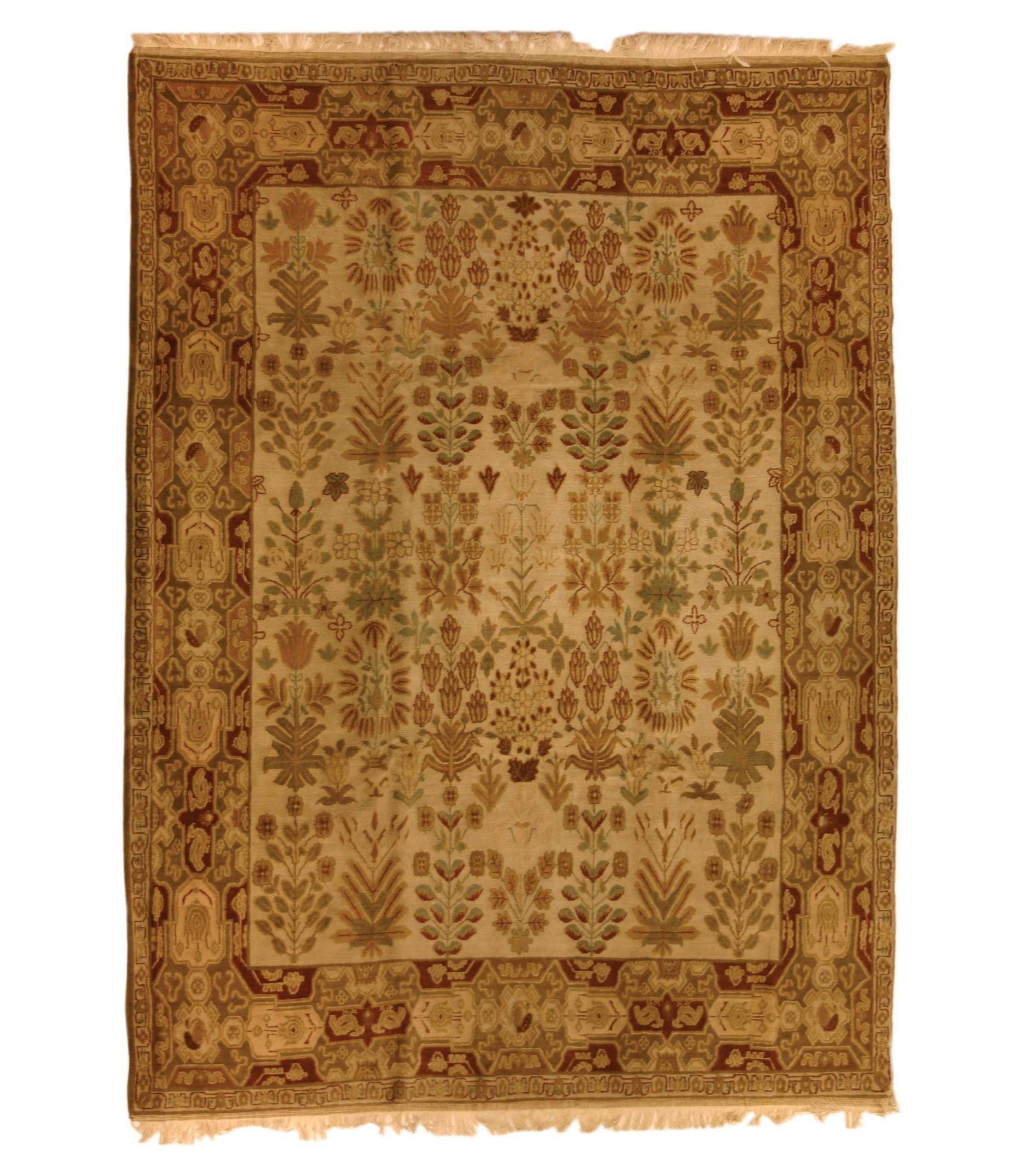 Exotic foliage motifs adorn this artisan handcrafted carpet in beautiful detail that will delight interiors. Kirman Oatmeal was hand-knotted in Nepal of 100% wool using our Shakti weave which has a smooth, luxurious finish and pile height of 0.28 inches. The field is oatmeal beige with accents in garnet red, golden beige, green and grey. This rug is available in size 6x9 and would work well in a home library, lounge or library.