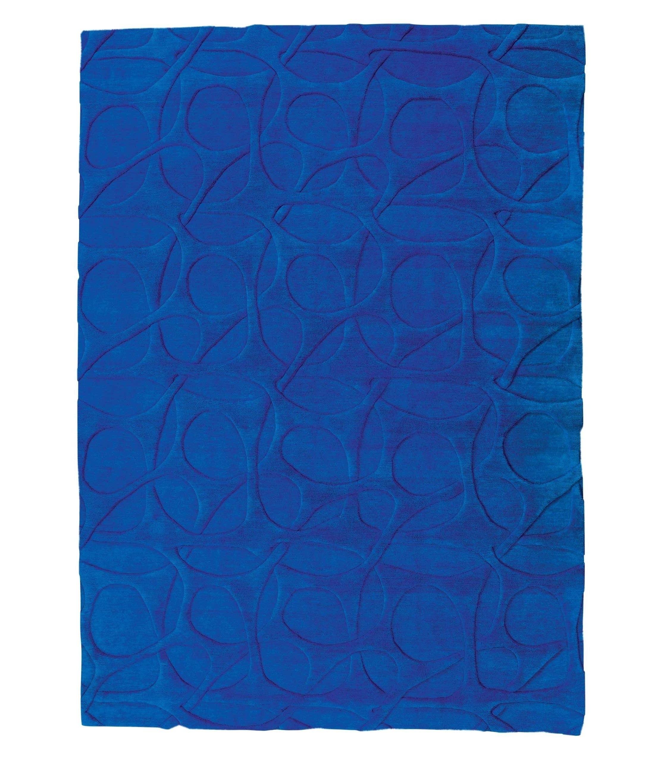 A Kevin Walz textured 100% wool rug in brilliant blue. Sometimes the magic happens post weave. A solid, color-saturated carpet with an intricate pattern hand carved in the finest Himalayan wool. An unexpected, contemporary gem of a rug you'll want to see from every angle.