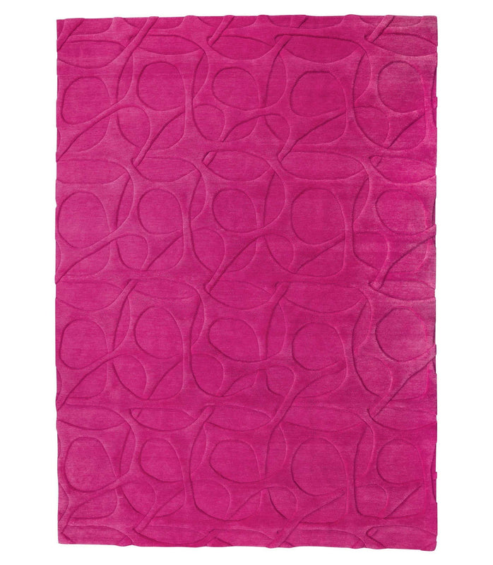 A Kevin Walz textured 100% wool rug in vibrant fuchsia. Sometimes the magic happens post weave. A solid, color-saturated carpet with an intricate pattern hand carved in the finest Himalayan wool. An unexpected, contemporary gem of a rug you'll want to see from every angle.
