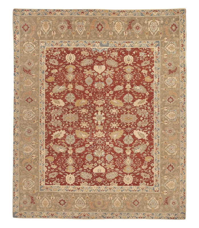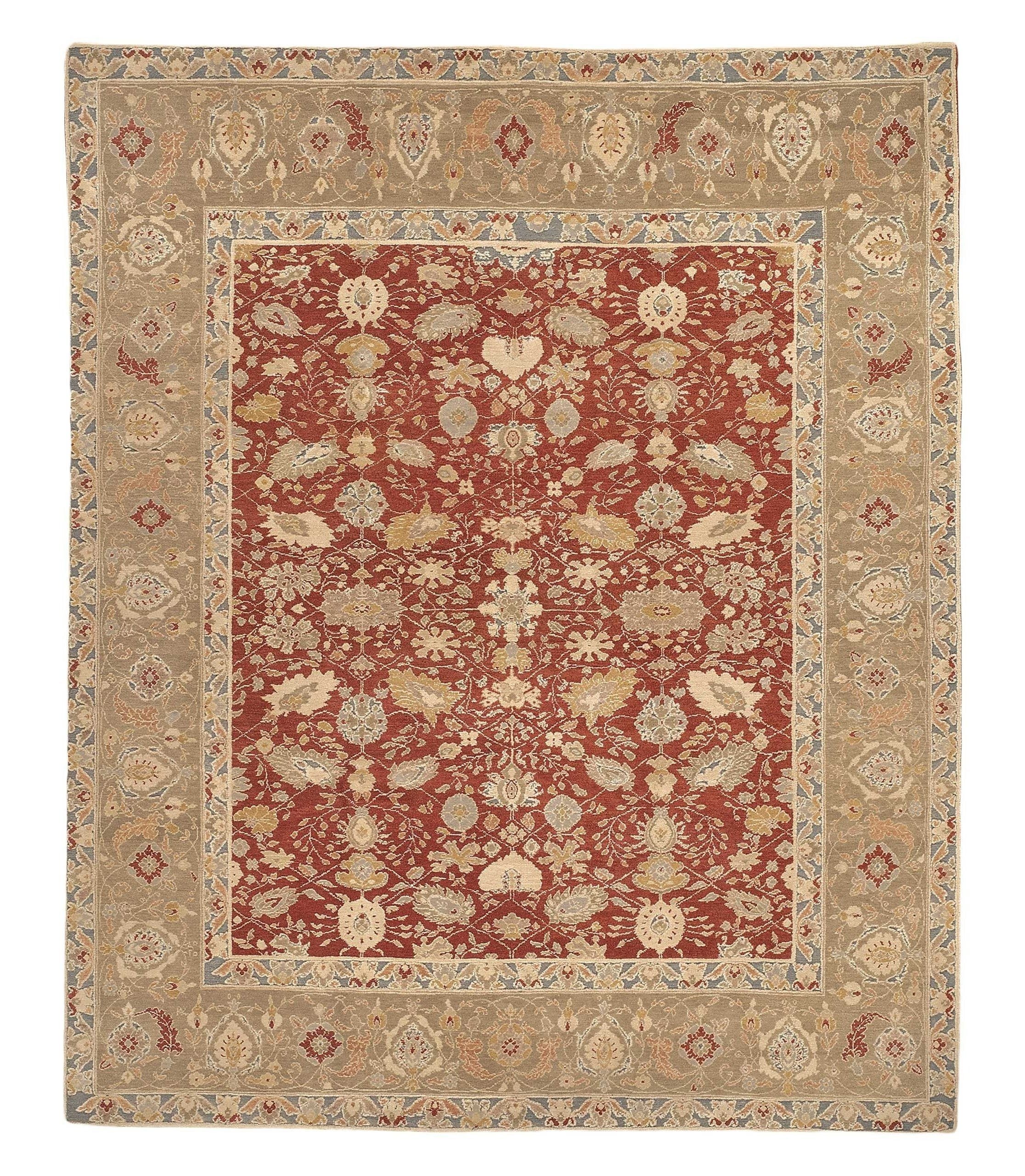 Jasmine is a traditional folkloric border rug with playful tribal detailing which is enhanced through the use of both standard woven pile and Soumakh flat weave accents. Intricate traditional motifs encompass the field of this area rug in the highest quality wool and handcrafted construction. Jasmine with Soumakh Red Willow was hand-knotted in Armenia using the Tufenkian Esfahan weave, our most luxurious Armenian quality which lends itself to delicate, fine detailed designs and is comparable to our Tibetan Shakti weave with a pile height of about 0.28 inches. The center field is a rich garnet red with accents in beige, ivory, steel blue, yellow and grey. The border has two components, there is the main thick border in light grey and a thin inner and outer border in steel blue using the flat weave.
