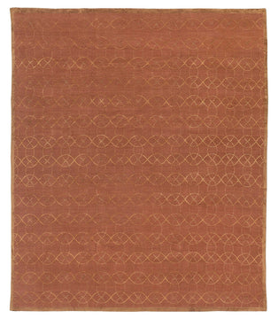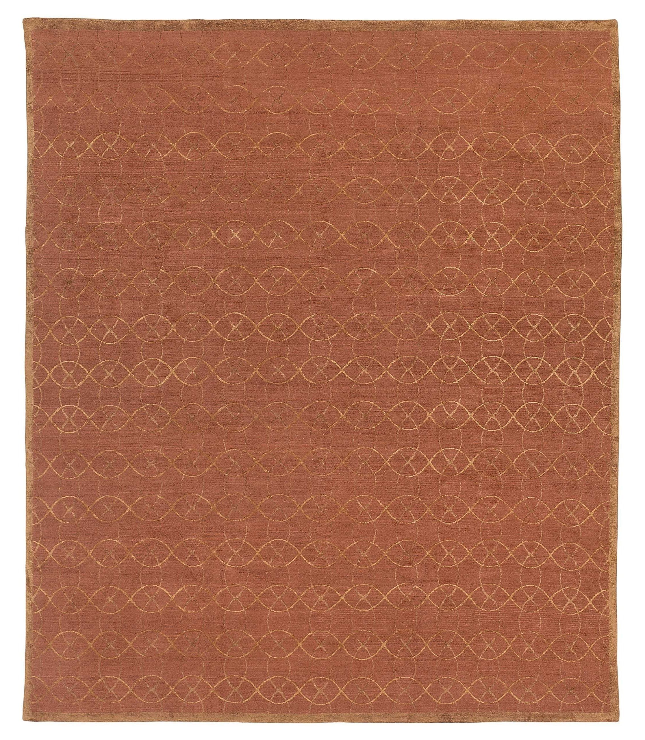 An elegant and transitional carpet by Barbara Barry that combines neutral color, subtle design and artisan handcrafting with silk accents to create movement and sheen. Barbara Barry's Interlace Auburn rug was hand-knotted of wool and silk in Nepal using our premium Shakti weave which has a pile height of about 0.28 inches and a soft, luxurious finish. The field is a light rust orange overlaid by golden honey silk accents and coordinating border, a rug to bring opulence to any space.