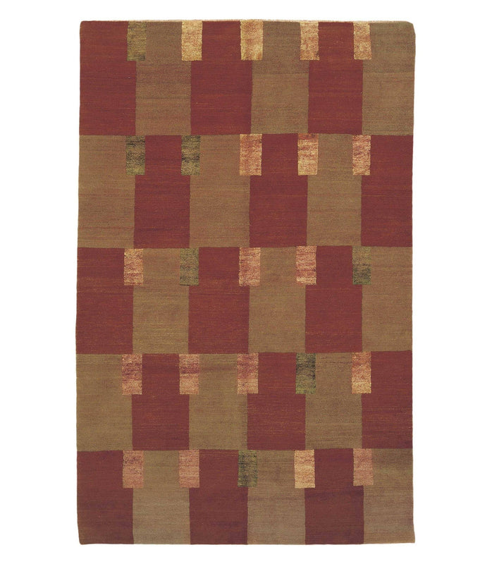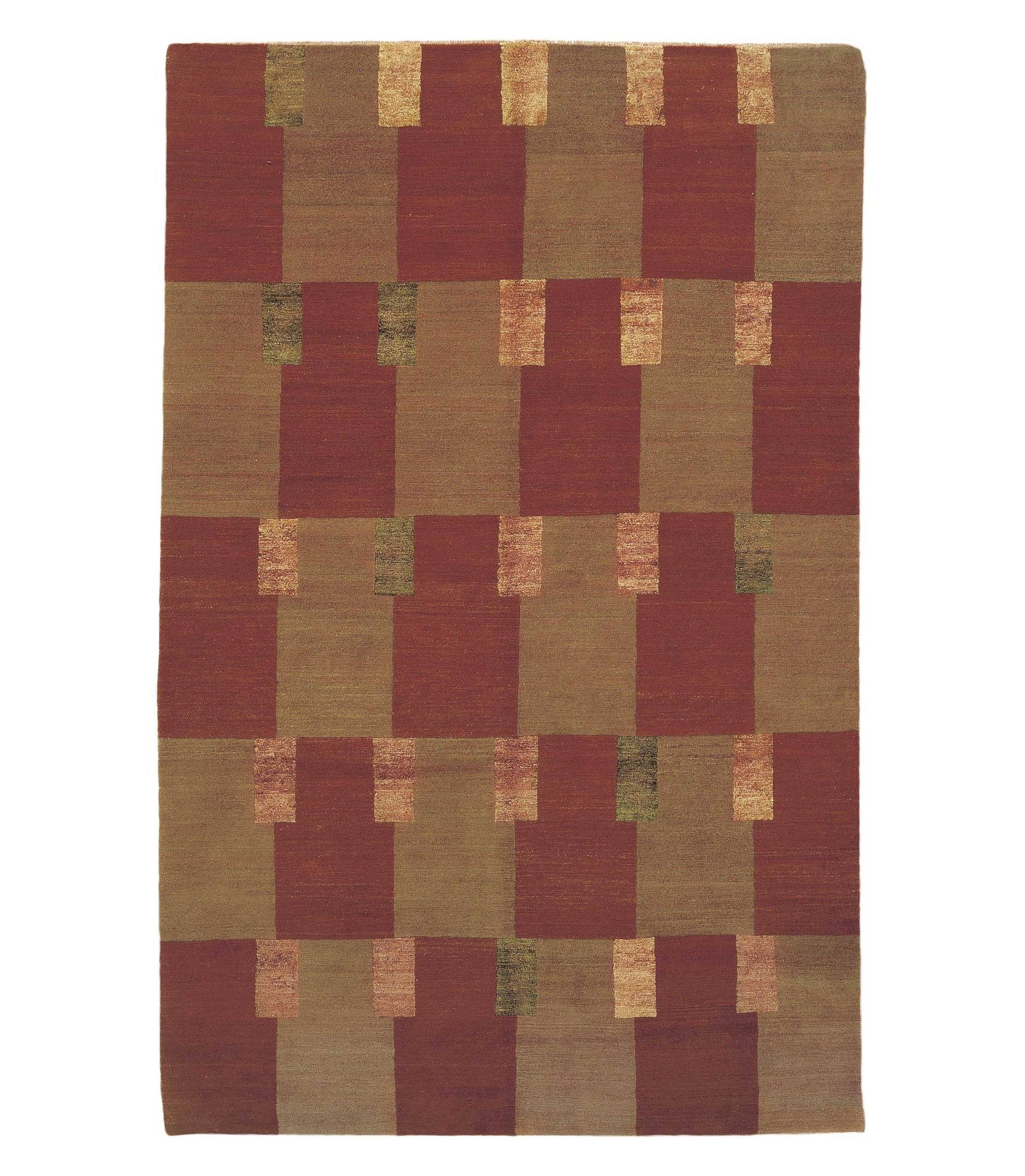 Grounding tiles of wool, tickled with silken accents create a rich and adaptable rug. The Double Square Pepperberry was handcrafted in Nepal using the finest Himalayan wool and silk. Our premium Shakti weave was used in this design which is our highest quality weave with an average pile height of 0.28 inches and a smooth and soft finish. This rug has a coral red and golden beige wool checkerboard base and is adorned with shimmering apricot and moss green silk accents.