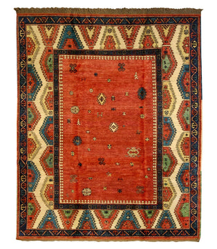 Bordjalu Red was hand knotted in Armenia of 100% wool using our Kazak weave which has a plush pile with a height around a third of an inch. This rug features a similar latch hook pattern seen in other Bordjalu rugs in the Kazak collection, however the pattern is used here just in the border. The hooks in the border design represent health happiness and protection. You will find many motifs and symbols in the field of this rug including human and animal figures, floral symbols and crosses, each with their own significance and meaning. The field is a bright, vibrant ruby red with accents in beige, blue, green and light yellow.