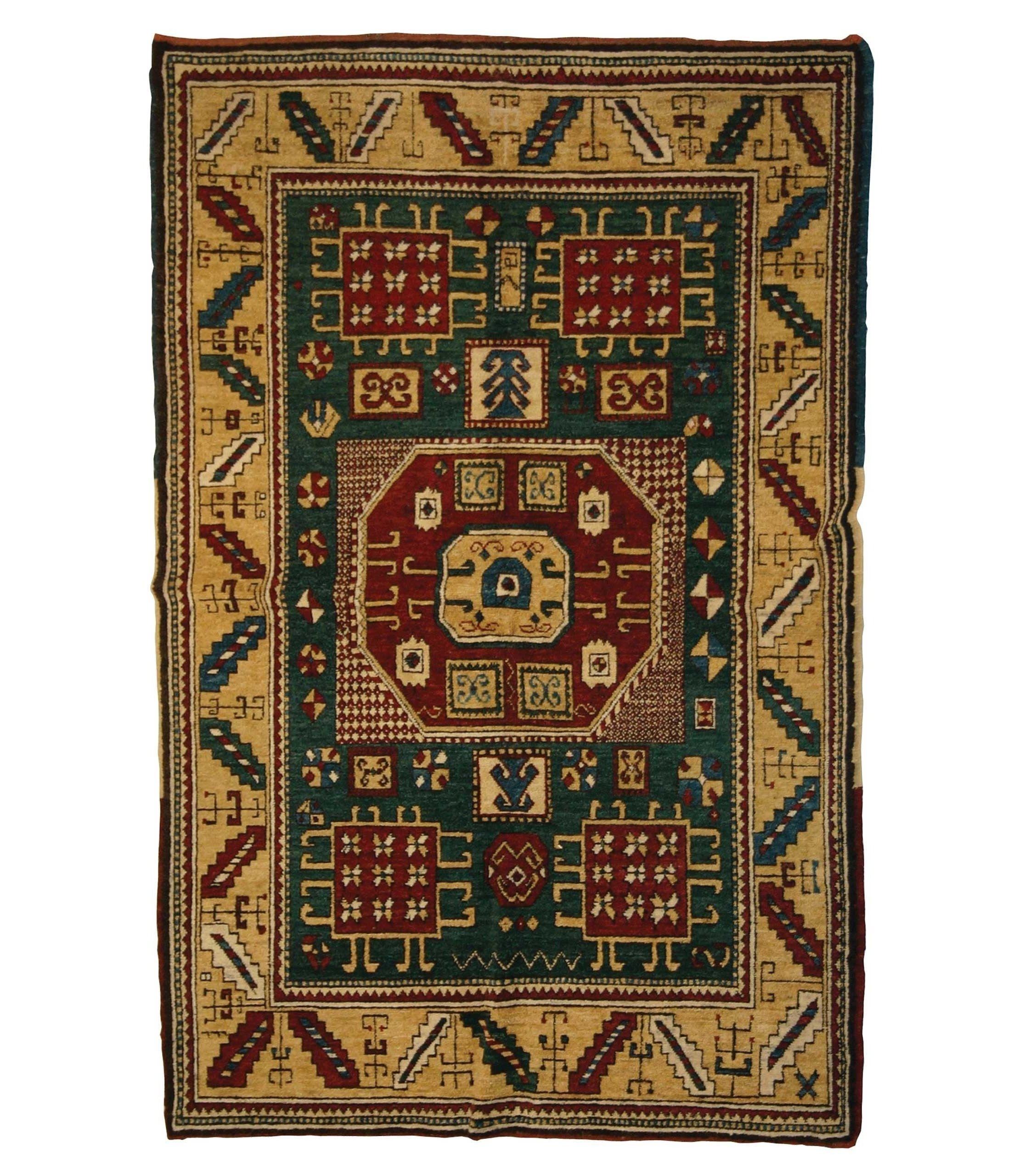 A tribal influenced Armenian Kazak weave rug in vibrant green, Karachopf III #T17 rug was handcrafted in Armenia of 100% wool using our plush Kazak weave which has a pile height around a third of an inch. Karachopf III #T17 is available features a lovely vibrant forest green field and golden yellow border. The center octoganal medallion is ruby red with accents of yellow, blue and green. This rug would be great for a foyer, bedroom, library or accent in a home office.