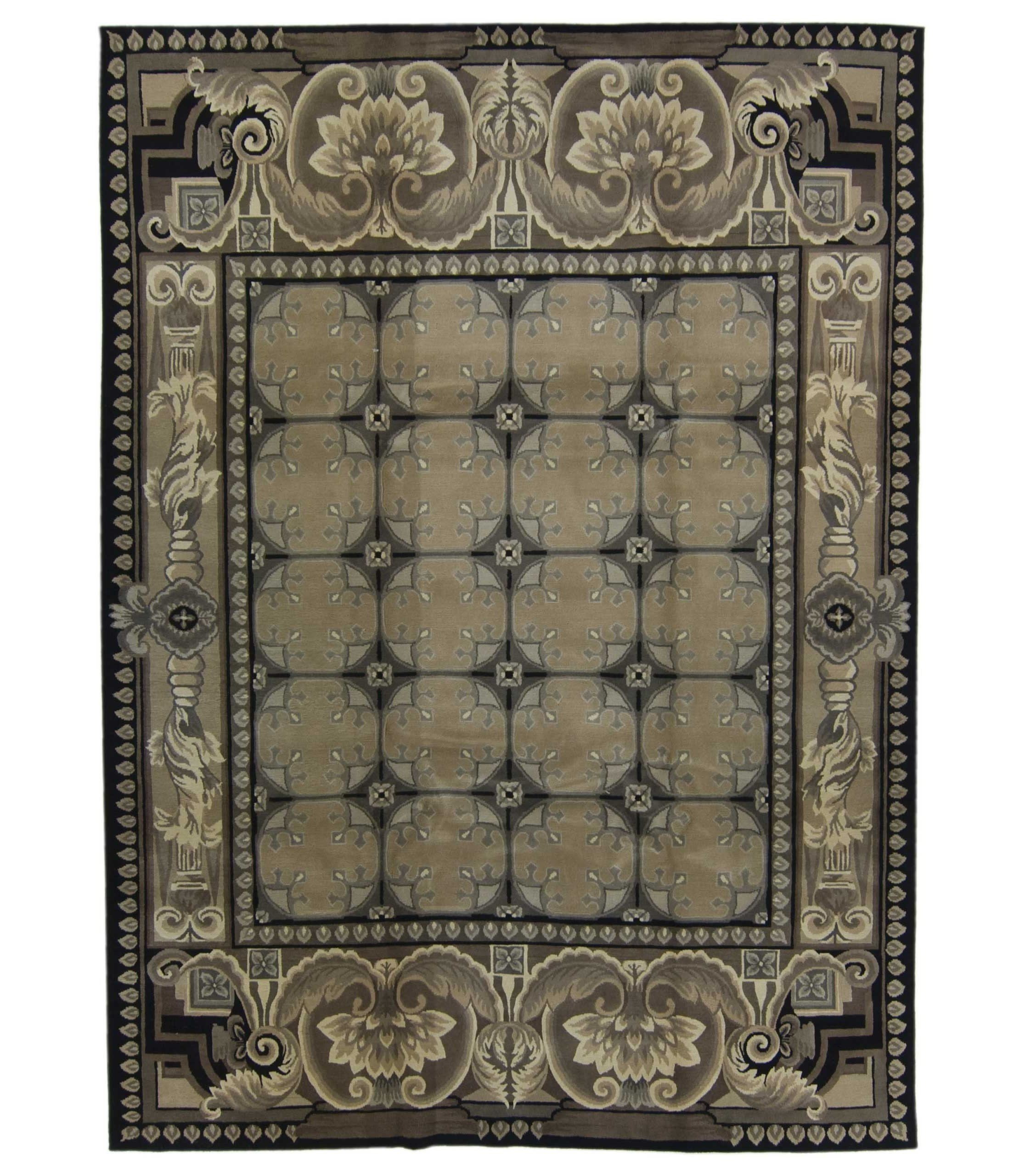 This Tibetan Timpa rug features a tile patterned field in a light chocolate brown with grey and black highlights. Surrounding the field is a border of decorative columns and rosettes in light brown and cream, with grey accents. This Tibetan Timpa Stock Rugs is hand knotted in Nepal of 100% Himalayan wool using our Timpa weave, which has a pile height of about 0.41 inches and a finish that is plush and soft to the touch.