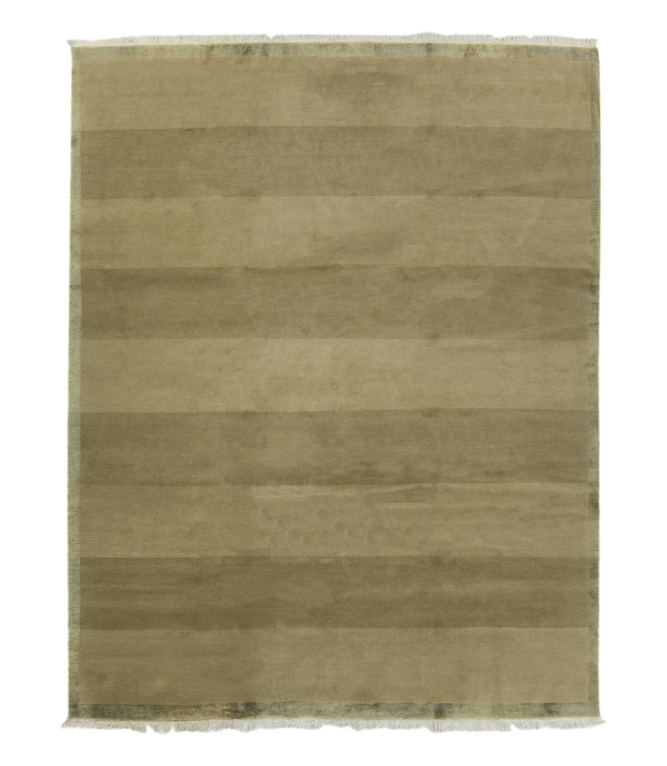 A hand woven Tibetan rug in beige and stone. This striped Tibetan Shakti rug features thick bands of stone and beige, with a thin grey border. It was hand knotted in Nepal of Himalayan wool and up to 10% silk using the Tufenkian Shakti weave.