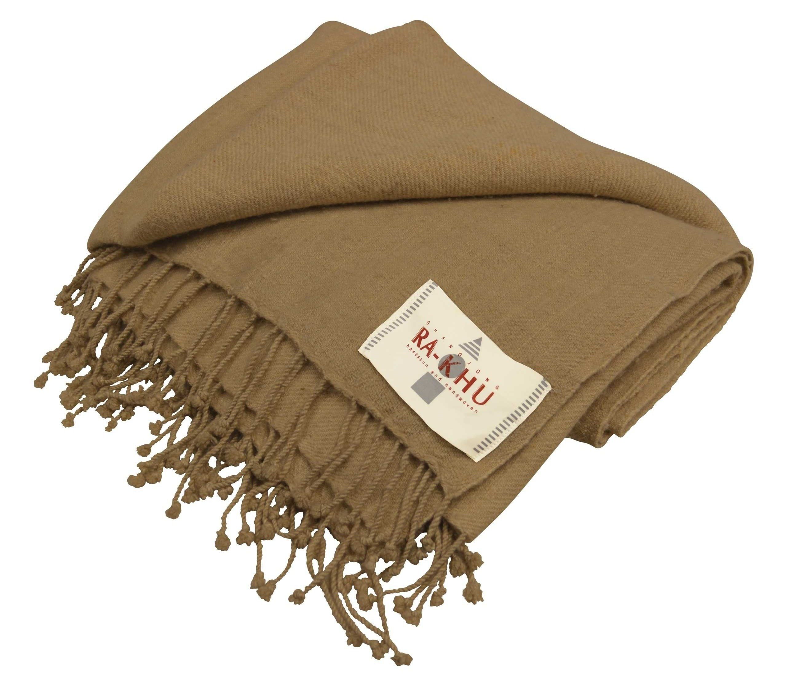 100% cashmere blanket in sandy beige. Rakhu Blanket Suede #249 was handcrafted in Nepal with hand collected and handspun Tibetan mountain goat cashmere wool. This blanket is available in size 7x9 with a softness and warmth that is irresistible to touch. Rakhu Blanket Suede is a lovely sandy beige which has a slight green undertone. This Rakhu Suede Blanket is available for immediate shipping. The production process for these blankets is quite meticulous which involves over 600 man hours to produce because of the fine quality of the fiber. The Rakhu blankets were produced with the same respect to the environment and artisan who craft them as with all of our products.