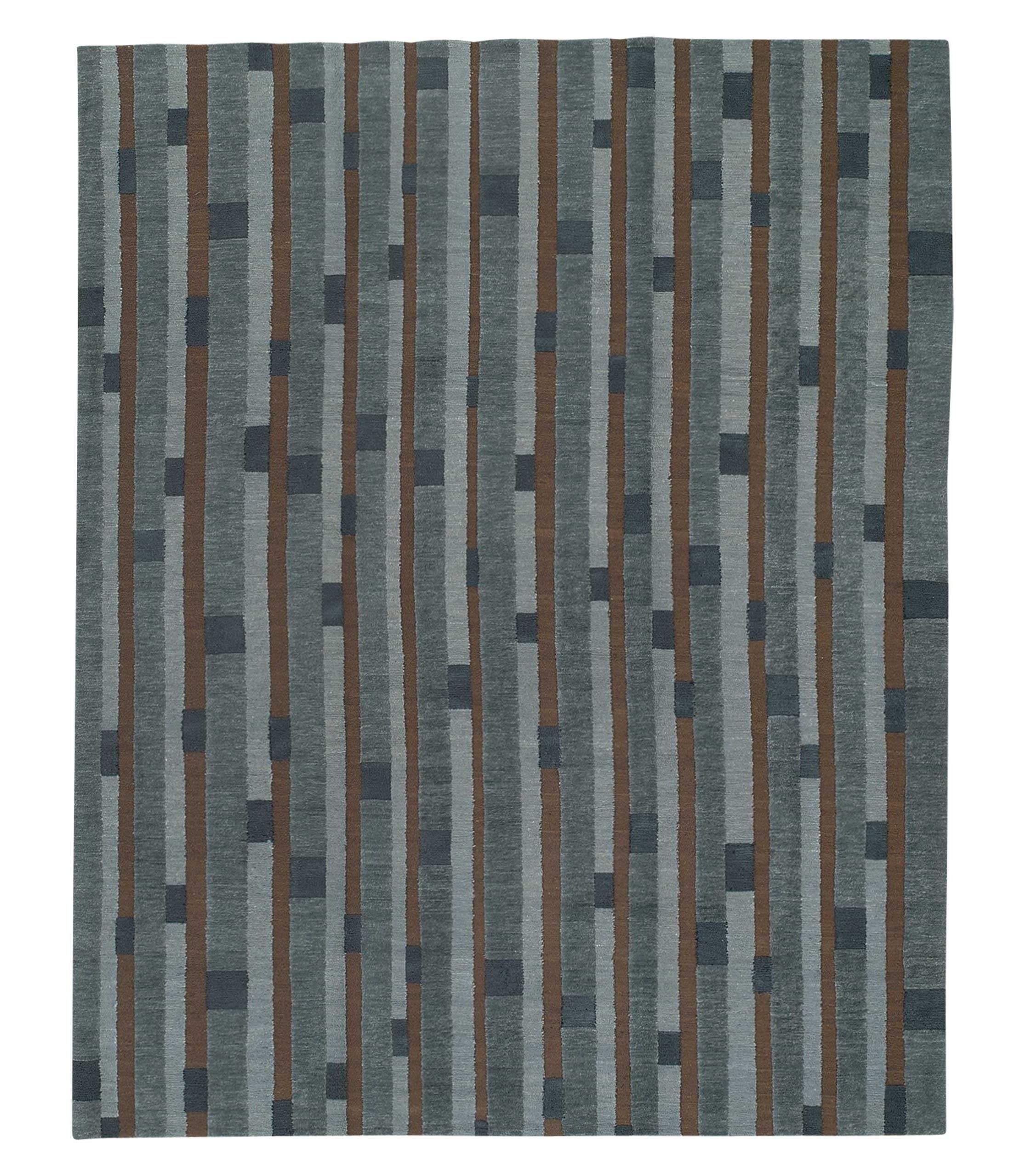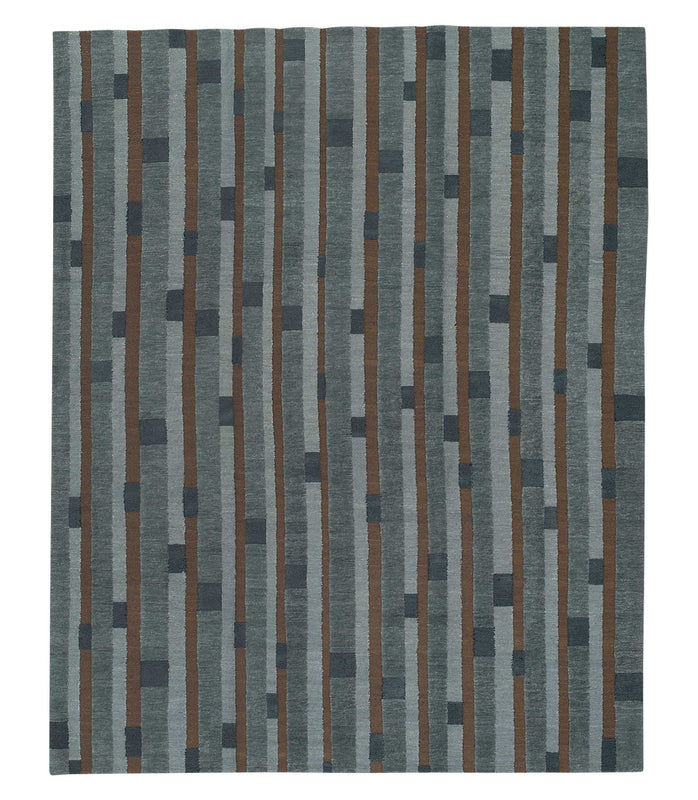 A subtle blend of color and texture, this rug combines a modern contrast of light and dark steel blue with brown to create depth in the design. Texture abounds in this handcrafted area rug with alternating cut and uncut loop pile. This rug would bring modern style to any dining room, living room or bedroom.