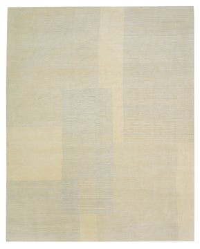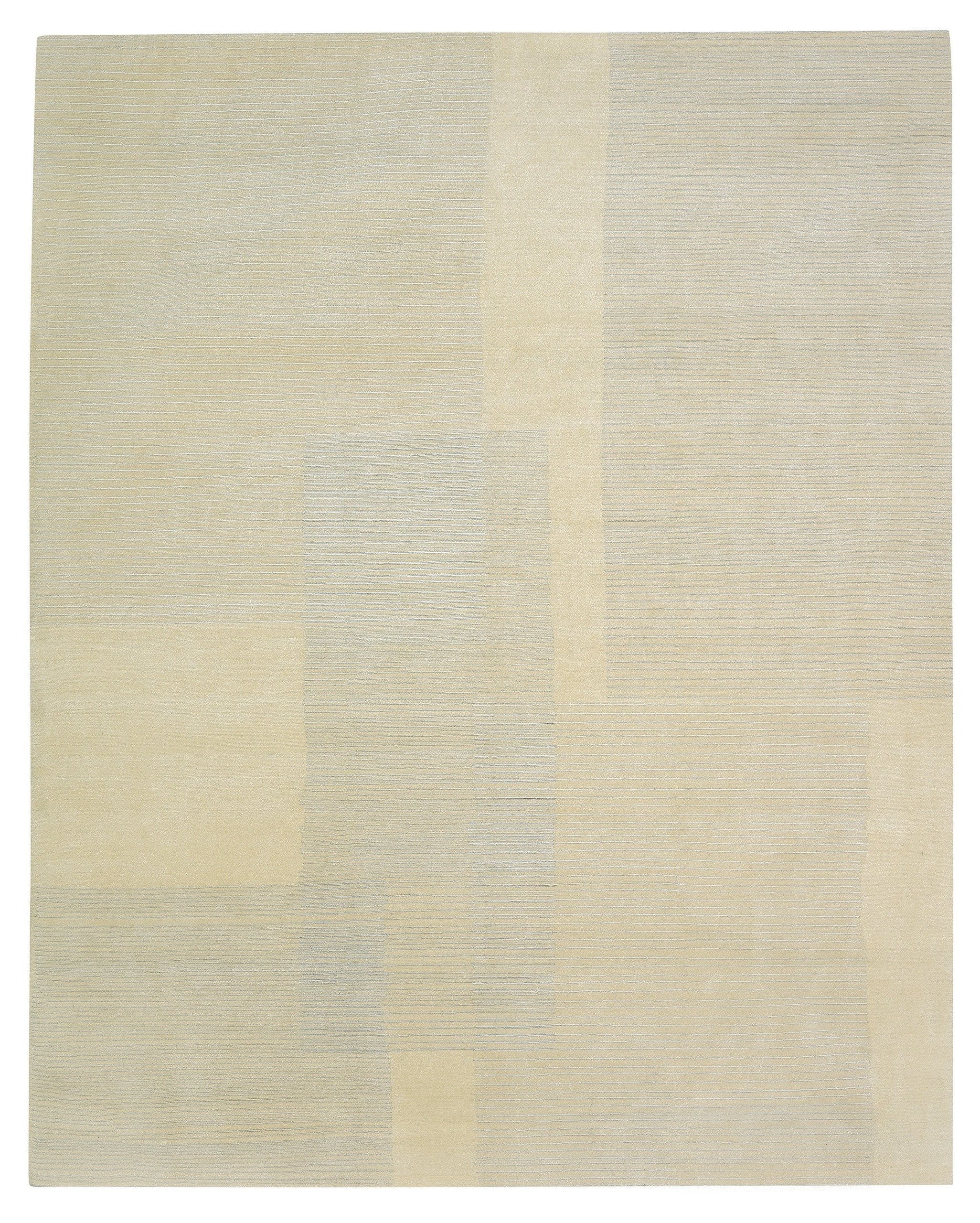 Contrasting colors bring depth to geometric patterns in this modern and contemporary carpet. An elegant silver pattern delicately overlays a creamy white field in a discrete contrast of colors. Hand knotted in Nepal of wool, linen, and bamboo silk.