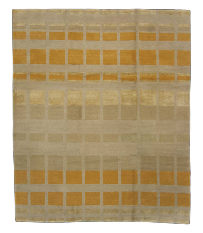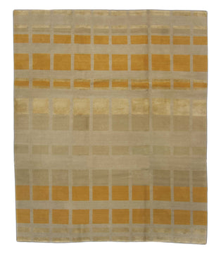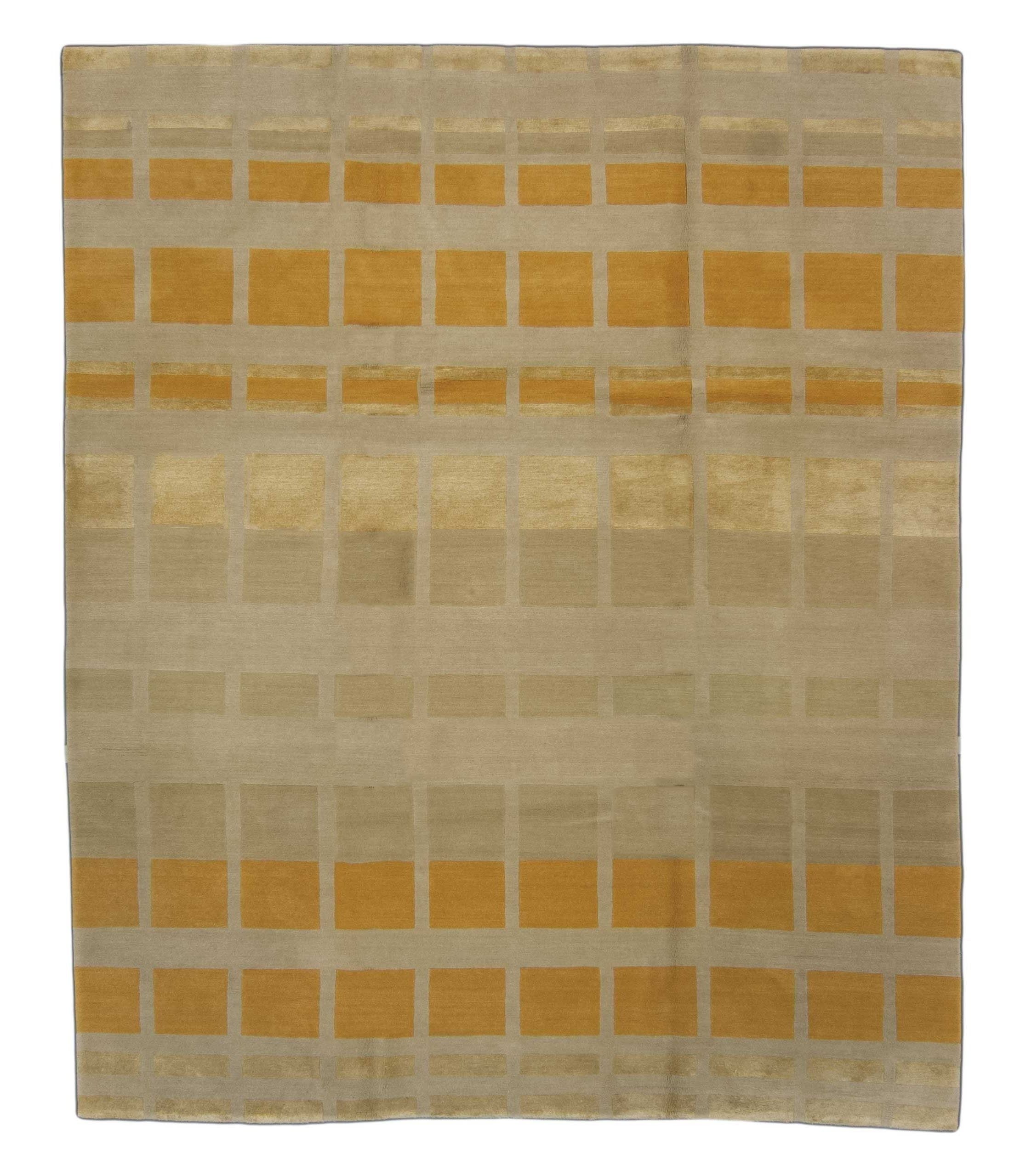 A nature inspired palate combined with even, linear design add up to a carpet that will ground a room. This Sliding Square Mango Ice rug was handcrafted in Nepal using our fine Shakti weave which has a pile height of about .028 inches. This rug is made of wool and 15% silk. Sliding Square Mango Ice has a light taupe field and wool accents in pumpkin orange and light moss green, the silk accent is a golden orange color.