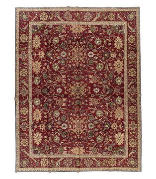 A handmade traditional Armenian Tabriz weave rug in red, Arax Chianti is an exquisite traditional Armenian rug hand-knotted of 100% wool using our Tabriz weave. The pile height is about 0.28 inches, similar to our Tibetan Shakti weave and boasts a soft, luxurious feel. This rug is will enliven any space with a red wine field and sapphire, ivory, beige, coral, yellow, and green accents.