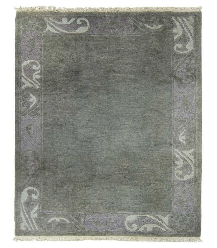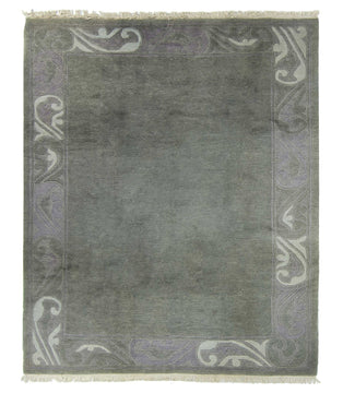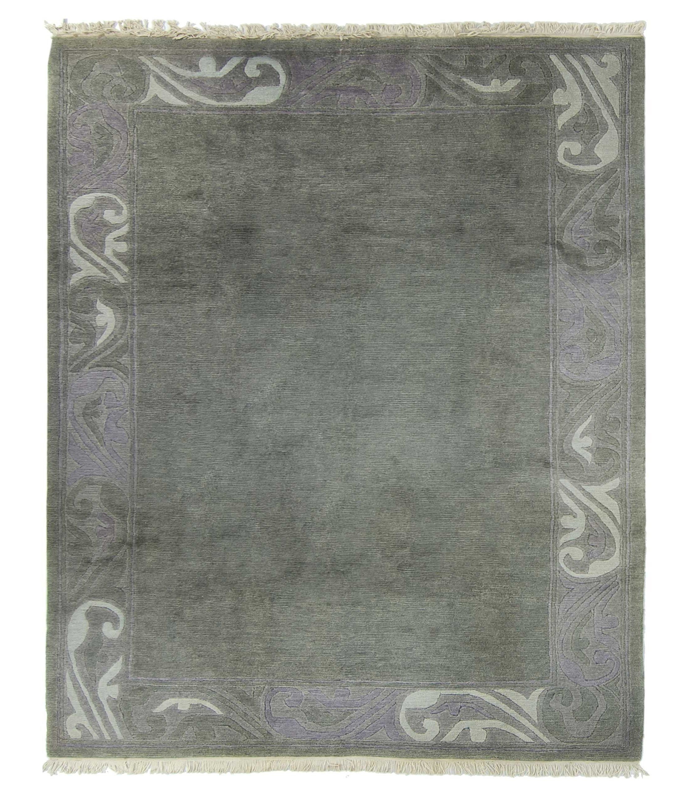 A beautiful grey Setana weave rug with a paisley border. Tibetan Setana Stock Rug is a one of a kind rug handcrafted in Nepal of the finest Himalayan wool using the Tufenkian Setana weave which has a pile height of about 0.55 inches. This Tibetan Setana Stock Rug is a popular grey color with an elegant paisley border in lavender and silver.
