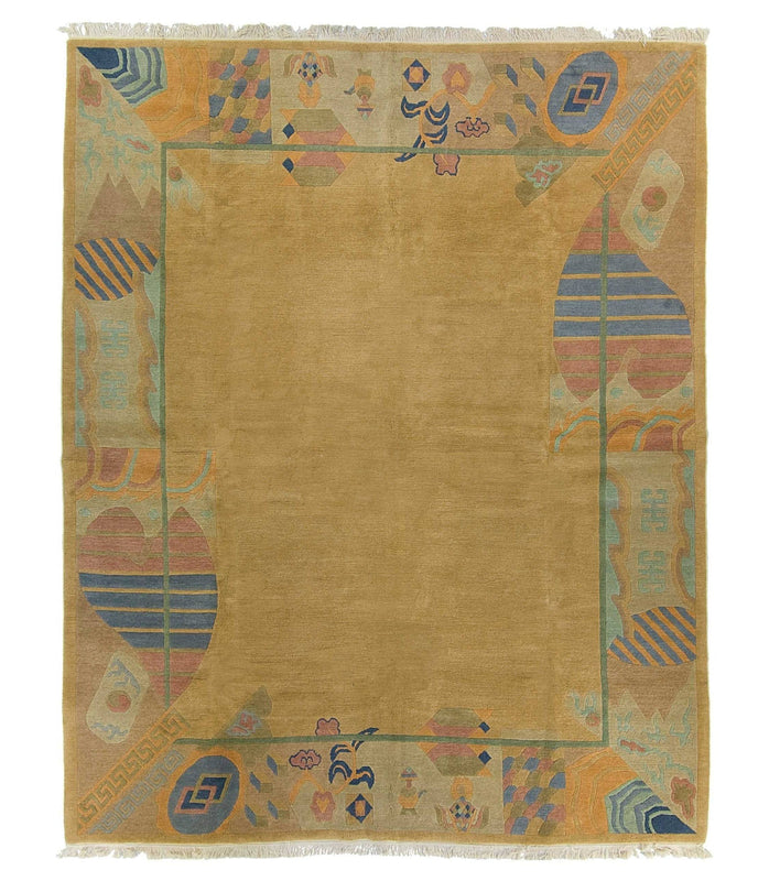 An exquisite Setana weave border rug with vibrant details. Tibetan Setana Stock Rug is an arts and crafts border rug with exquisite detail and vibrant accent colors. Although it has a generic name, this rug is anything but, rather its a one of a kind work of art crafted of heirloom quality. This rug was hand-knotted in Nepal of the finest 100% Himalayan wool using the Tufenkian Setana weave which has a pile height of about 0.55 inches, a plush and luxurious carpet for any room. The field of this rug is light brown with an orange undertone and border accents in navy, rose, pumpkin orange, sage green, golden brown, spruce green and aqua. The border design incorporates a variety of abstract shapes and figures, some of which have a three dimensional quality.