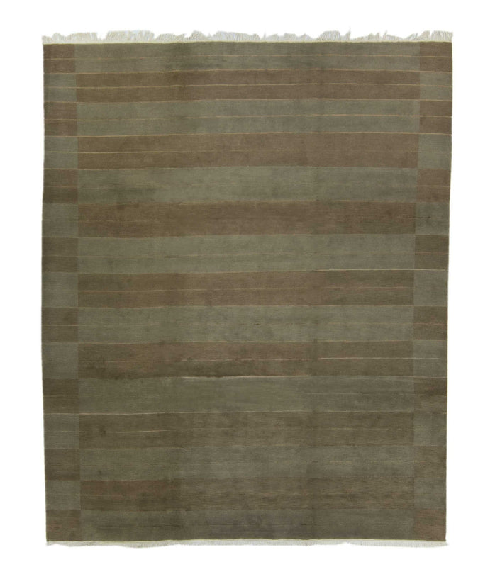 A hand woven Tibetan rug in grey and brown, this contemporary style Tibetan Shakti rug features beautiful bands of stone and chocolate divided by pale orange lines. It was hand knotted in Nepal of Himalayan wool and up to 10% silk using the Tufenkian Shakti weave, and features a smooth finish and pile height of about 0.28 inches.
