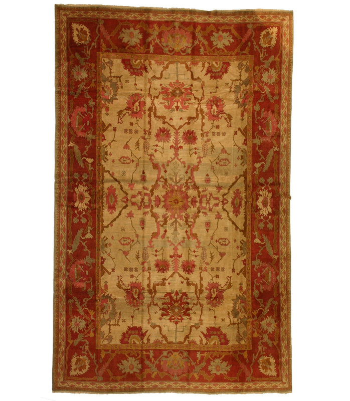 An Armenian golden beige Esfahan weave rug. This Abraham rug was hand knotted in Armenia using 100% Armenian wool with the Tufenkian Esfahan construction. The Esfahan weave used in this design is our most luxurious Armenian quality, comparable to our Tibetan Shakti weave. The Abraham rug is dyed with all natural vegetable dyes which deliberately creates color shadings and striation in the delicate and refined designs of this rug. This Abraham rug features a subdued palette of golden beige and rosy reds with balanced symmetric designs of elegantly sculpted fields of floral motifs.