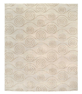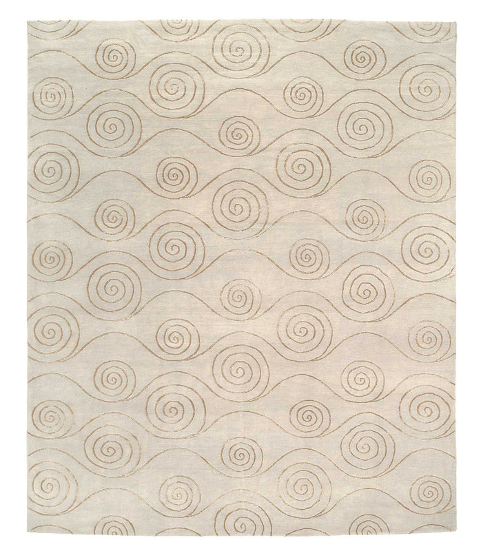 A whimsical motif in shimmering gold silk create a lively mood amid a pearl white wool field. An area rug to unite the interior of a room.