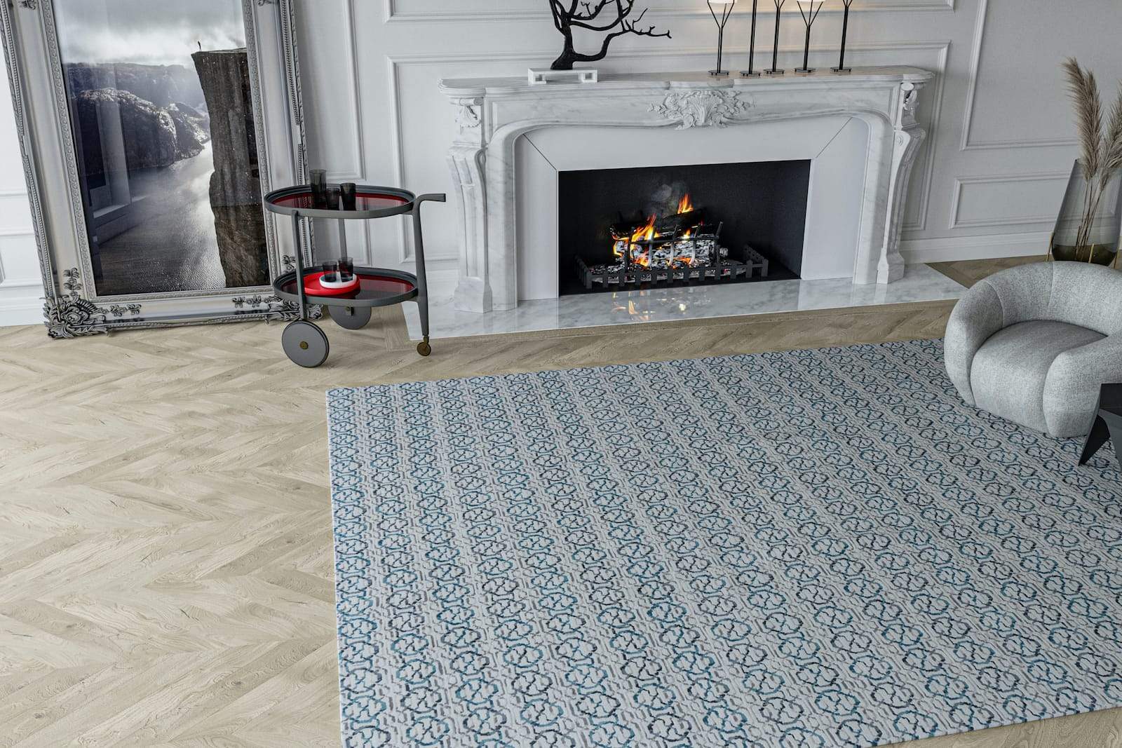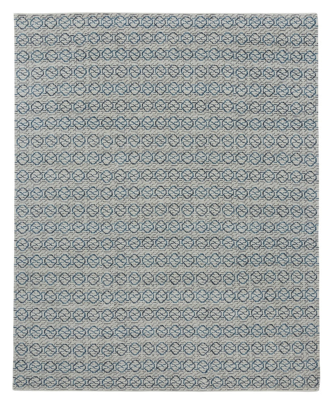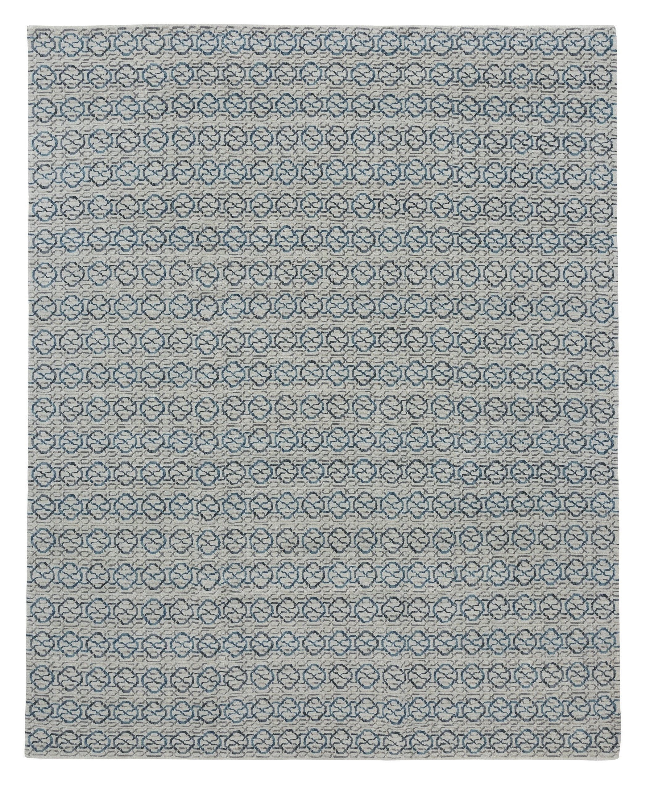 Bright blue and grey chains draw the eye over a light field and encourage the viewer to appreciate the craftsmanship of this calming loop and link motif. Linen tweeded into the wool adds texture and the repeating geometric pattern makes for a transitional style that will fit into a variety of room designs.