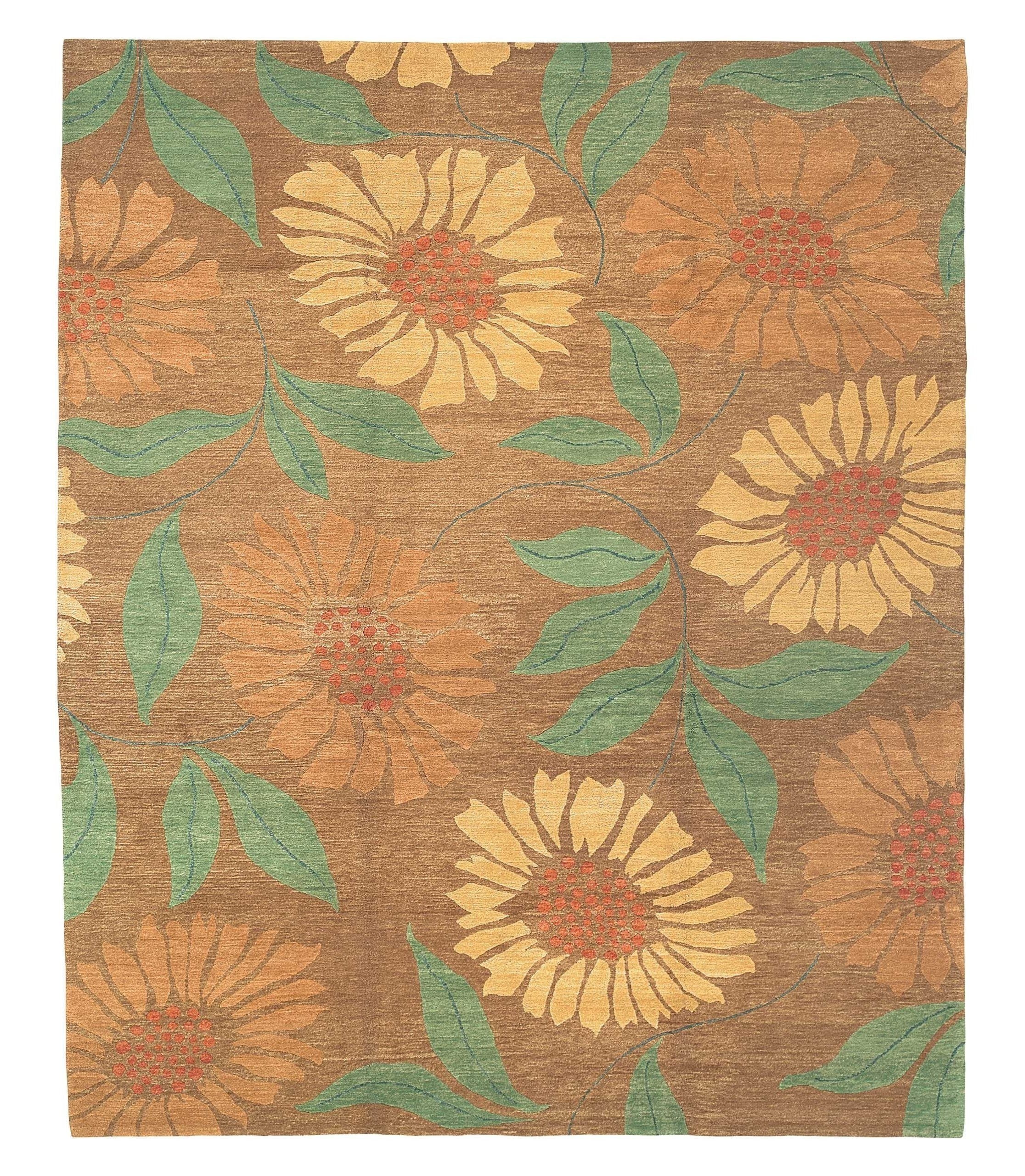 Flower Power is a modern overstated floral patterned rug that will delight interiors. This rug was handcrafted in Nepal of 100% wool using our lovely, plush Kotana weave which has a pile height of about 0.41 inches. Flower Power Cornstalk has a dark beige field with bright flowers featuring light yellow and caramel petals, and leafy green vines. This rug would work well in a game room, family room, or dining room.