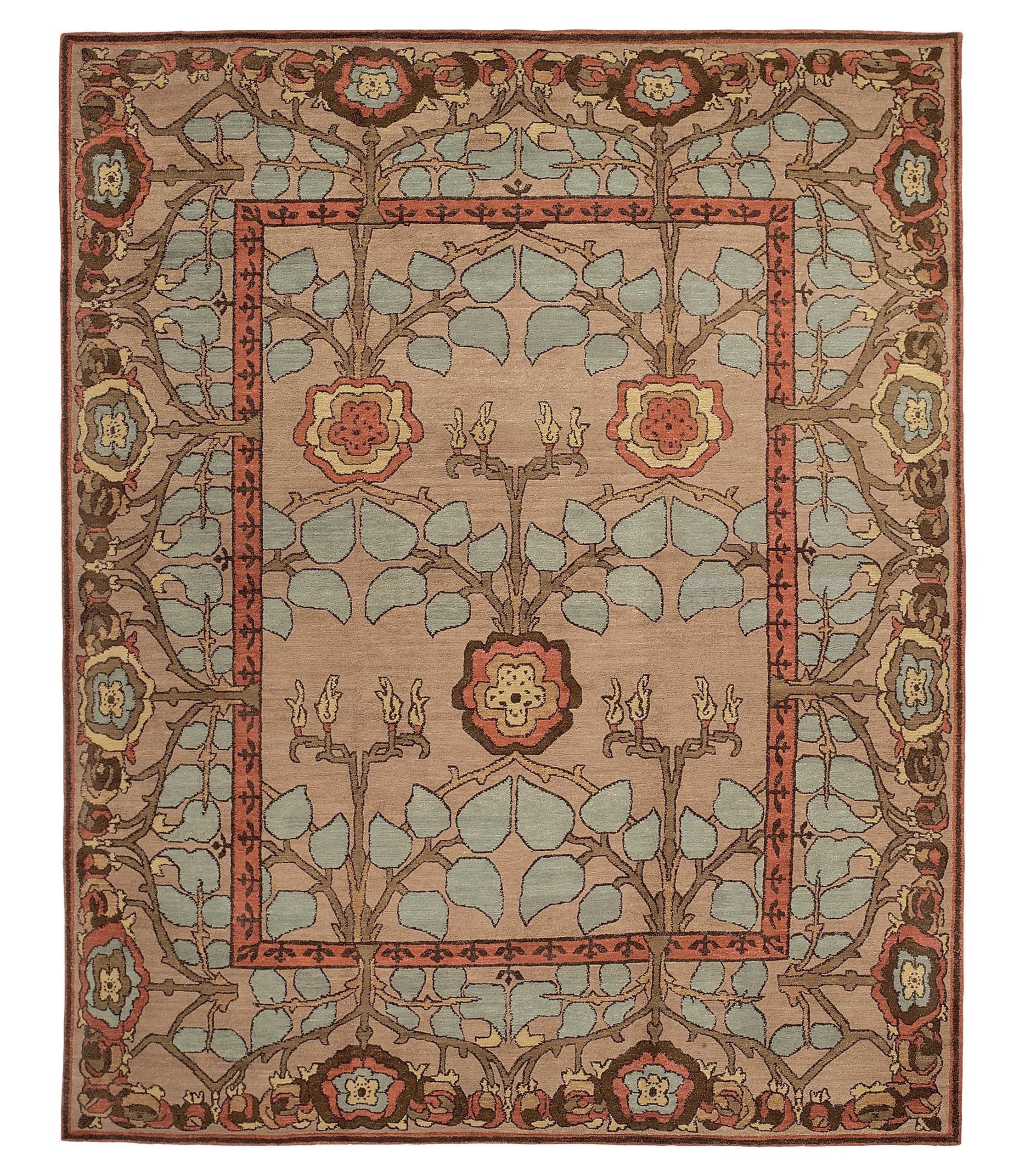 Like a majestic stained glass window for your floors. Inverness Blue Quartz is a lovely border print that goes outside the lines, handcrafted in Nepal of 100% Himalayan wool. Our Tibetan Kotana weave was used for this design which lends a plush feel to the wool with a pile height of about 0.41 inches. Inverness Blue Quartz has a gorgeous warm oatmeal beige field adorned with floral vines in accent colors of light steel blue, yellow, brown and rosy orange.
