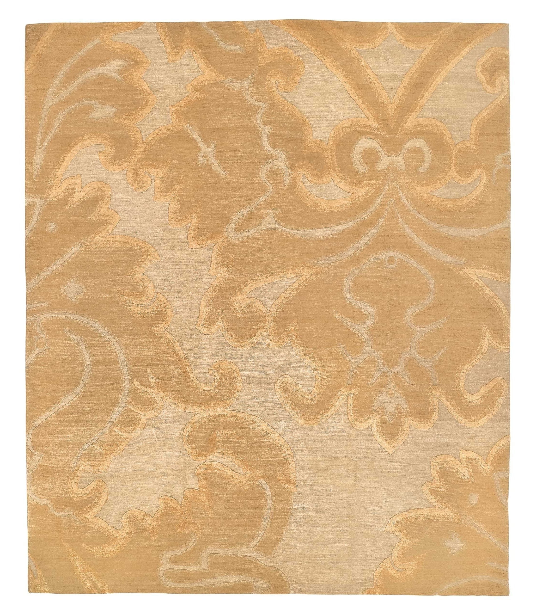 A modern interpretation of traditional grandeur, the Implied Damask rug is unexpected and asymmetrical, contemporary elegance for any grand space. Implied Damask Golden Apricot was hand knotted in the finest Himalayan wool and richest silk using our premium Shakti quality weave. The pile height is an average of 0.28 inches and offers a smooth, luxurious finish you can't help but touch. The Background color is a light grey beige which is sheared, the design is a golden taupe which is adorned with lovely silken orange accents.