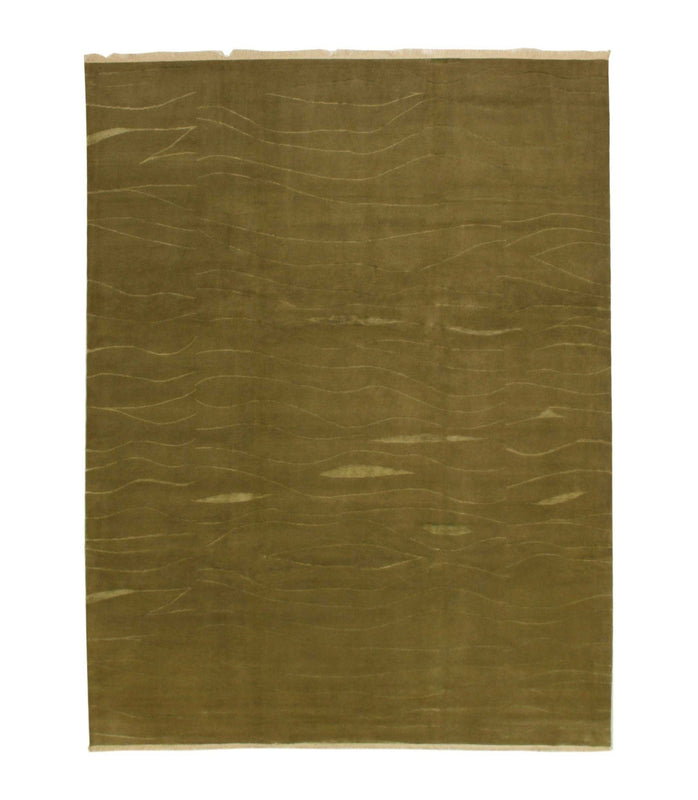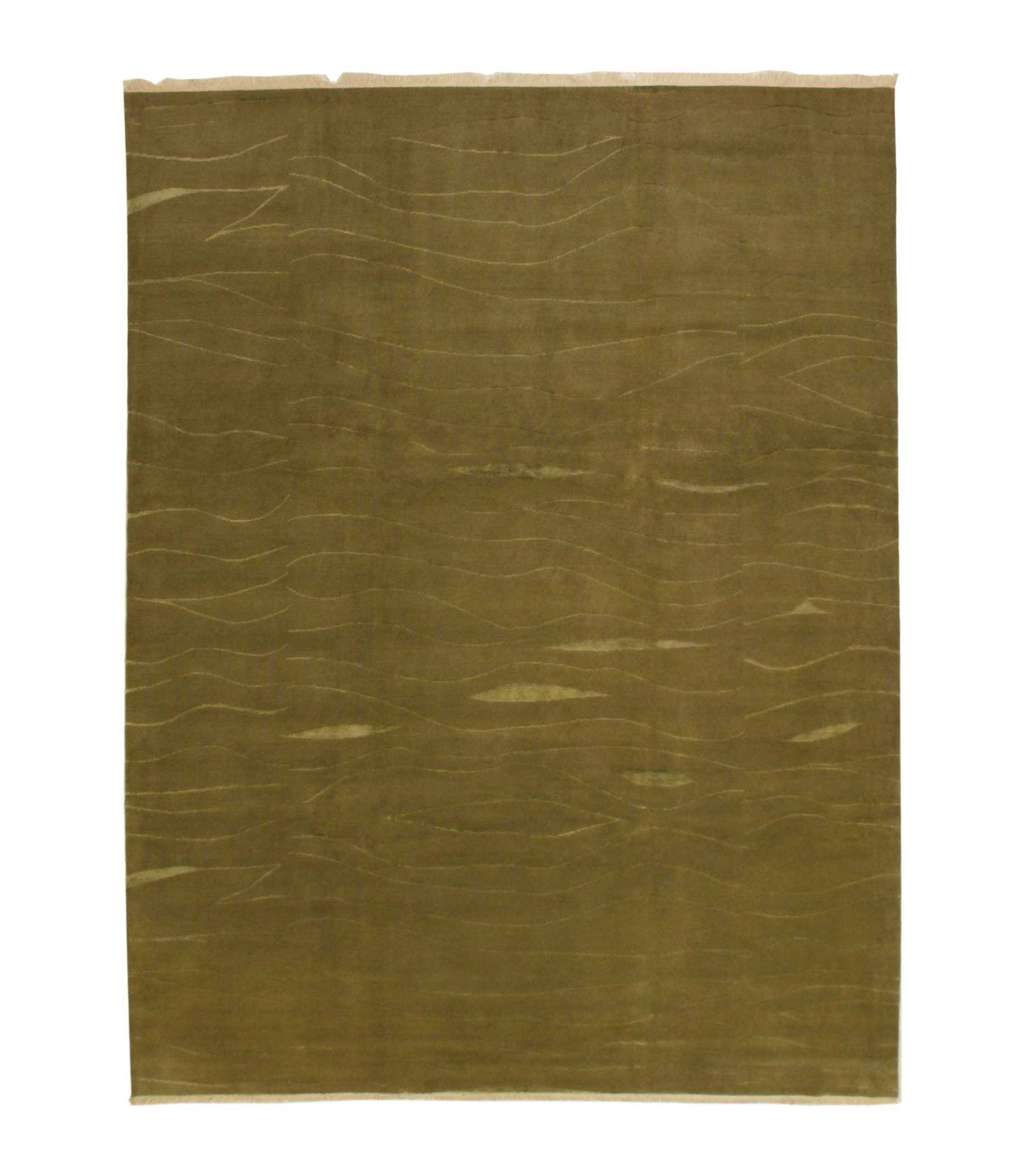 This Tibetan Shakti rug features a bronze field with abstract silver waves. Its lovely metallic shimmer is created with hand spun silk; the balance of the rug was crafted from Himalayan wool. Woven in Nepal using the Tufenkian Shakti weave, this rug features a smooth finish and pile height of about 0.28 inches.