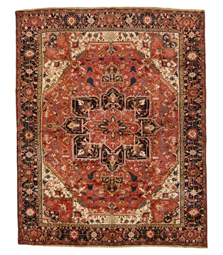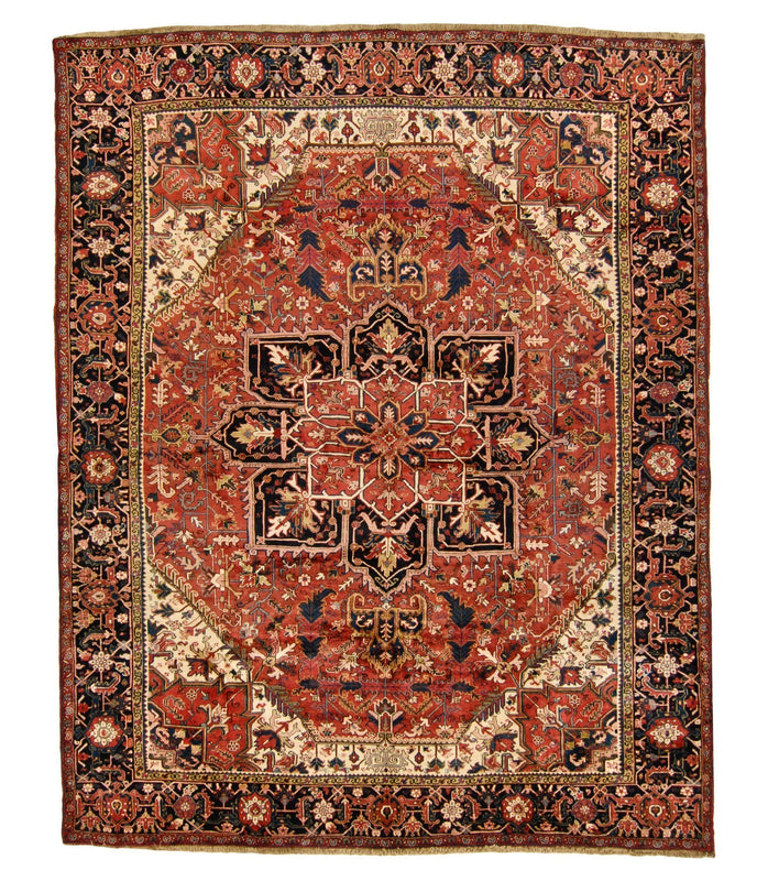 Made of 100% Persian wool, this hand woven semi-antique Heriz was made in Iran prior to 1949. It measures 10' 1" x 12' 6".