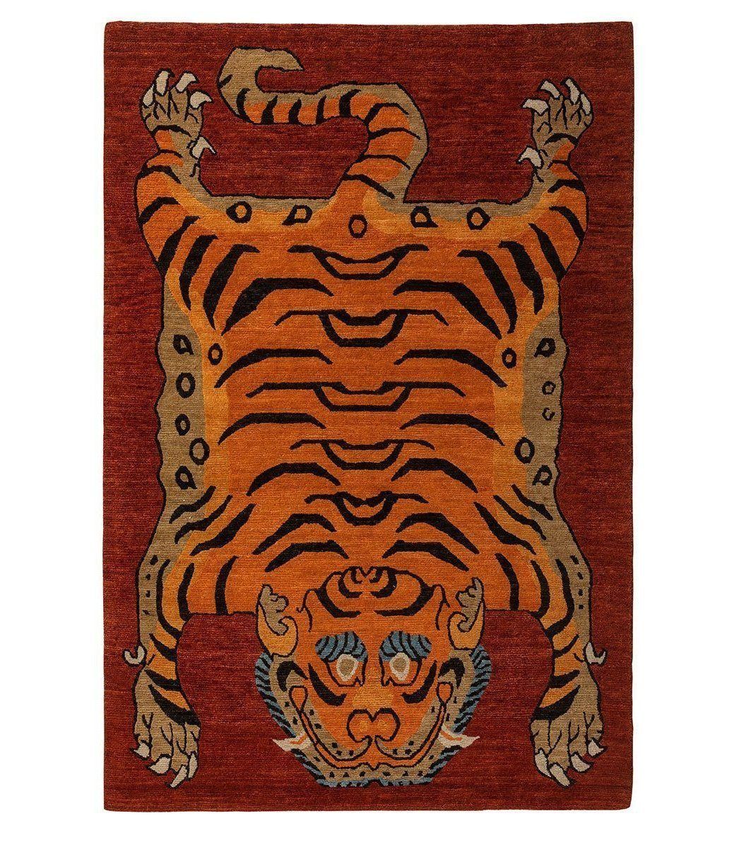 The art of the hand flourishes in a traditional hand knotted tiger rug. Awaken interiors with Tibetan red hues which set the foundation for the majestic motif. Walter Rust is only stocked as a 4x6, but may be created as a custom rug in other sizes; contact us or Request a Quote for more information.
