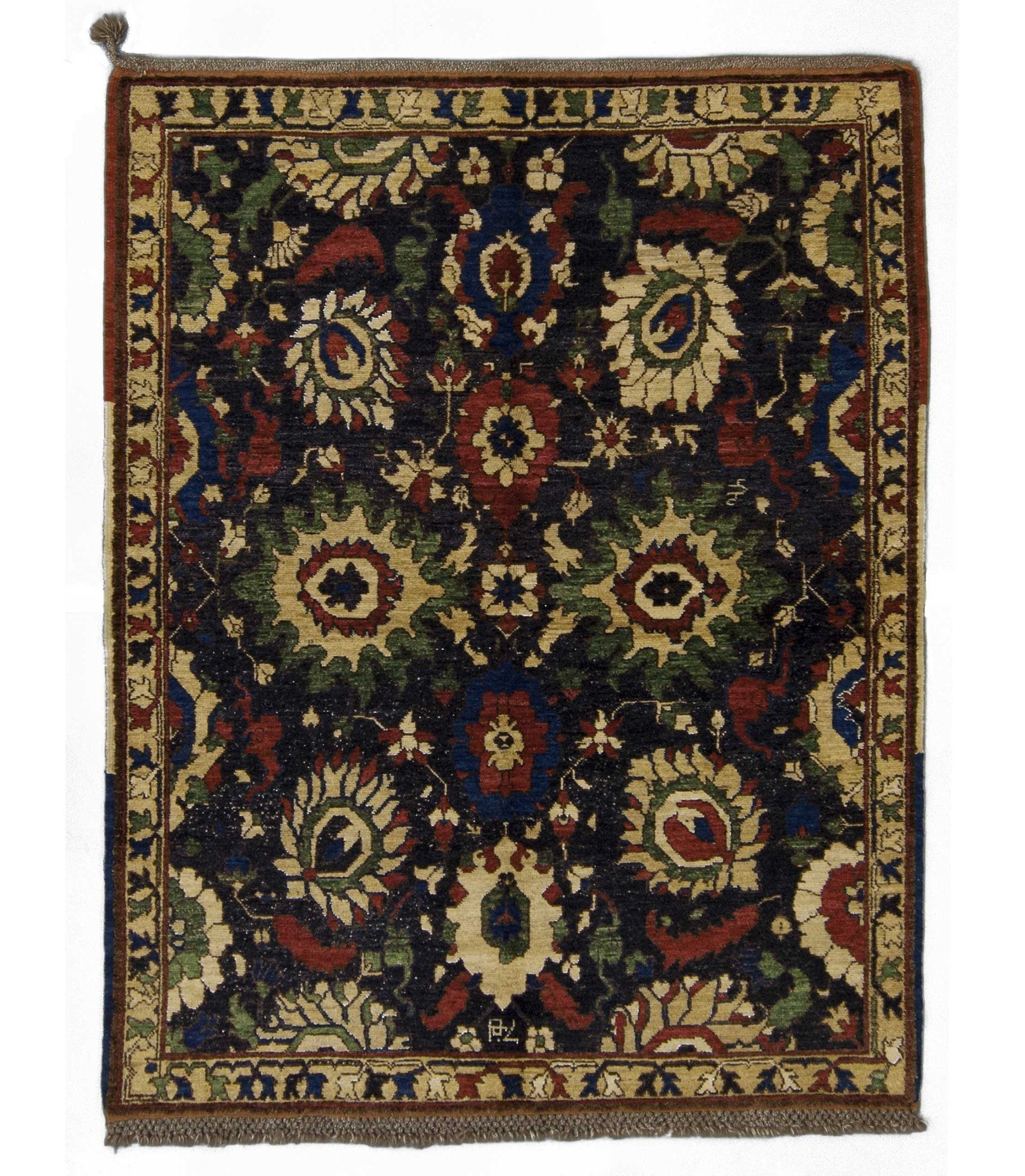 A floral Armenian Kazak weave wool rug in black, this Bakhtiar II rug is among our most distinctive Armenian carpet designs. Bakhtiar II was hand knotted in Armenia of 100% wool using our Kazak weave which has a pile height around a third of an inch. This rug has graceful, floral motifs in colors of light yellow, olive green, royal blue and ruby over a black field.