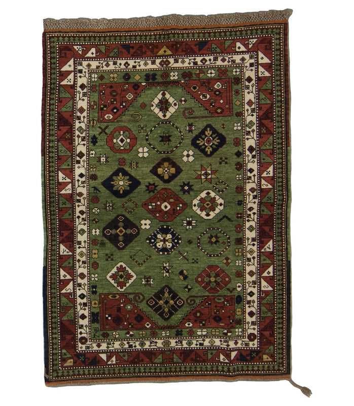 This Gendge Gul rug was handcrafted in Armenia of 100% wool using our Kazak weave which has a plush pile height of about a third of an inch. Historically Gendge rugs were woven in the town of Gendje and were most often produced as runners with designs resembling Kazaks, except for a more prominent use of light blue and ivory and the frequent use of small, repeating design elements. This rug is an interpretation of the Caucasian rugs and features an olive green field adorned in floral and star motifs.