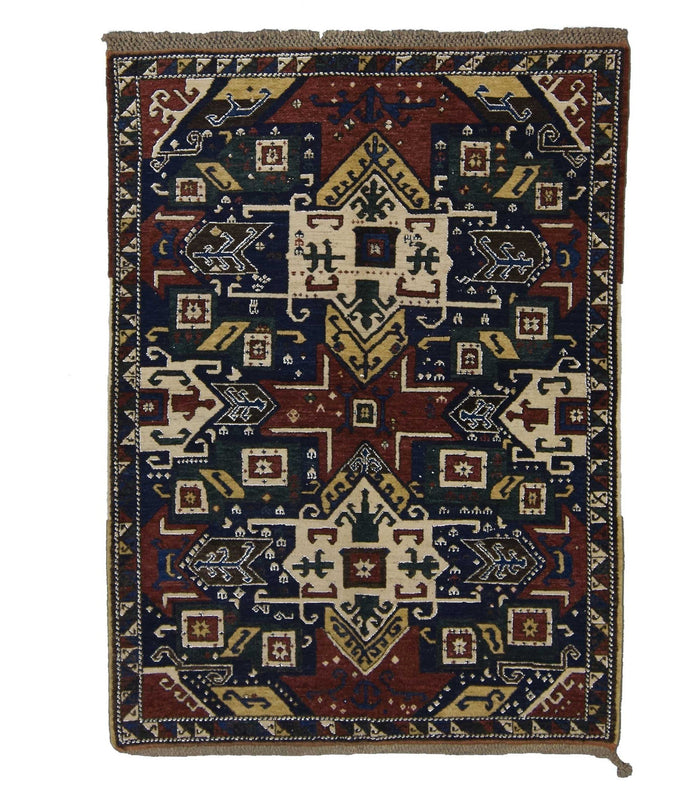 A star motif Armenian Kazak weave wool rug in multi-color, this rug was hand-knotted of 100% Armenian wool using our Kazak weave which has a pile height around a third of an inch. The field has an all over pattern of tribal motifs focused around the star symbol which is used to express happiness and fertility. The colors used in this carpet are bright an energetic with red, yellow, ivory, brown, spruce green and different shades of blue.