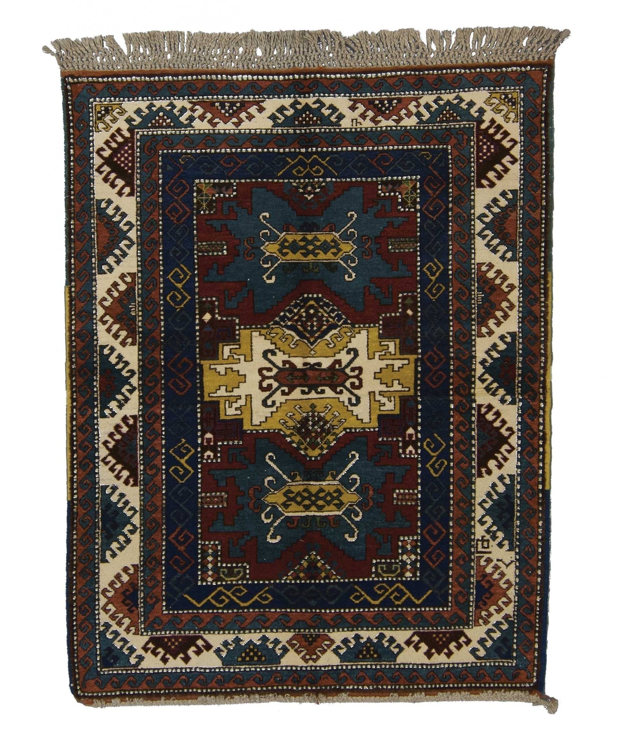 This Kazakh II rug is hand knotted of 100% Armenian wool and has a pile height around a third of an inch. This Kazakh II rug features three center star medallions and makes use of latch hooks in the border design. The colors in this rug include dark and light blue, vibrant yellow, ruby red, and accents ivory white, and light forest green.