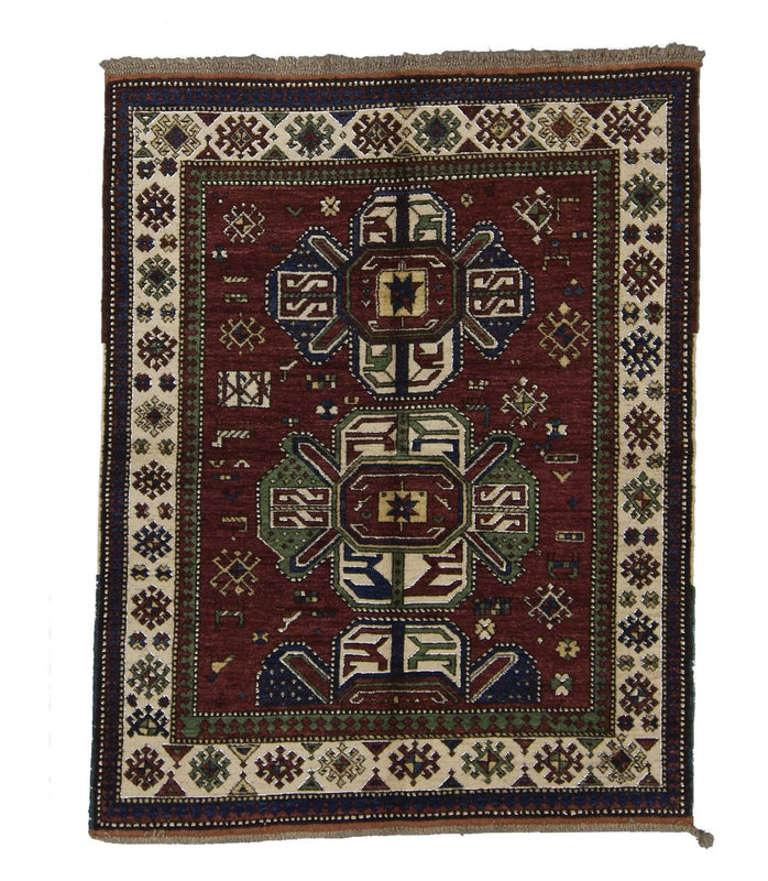 A tribal Armenian Kazak weave wool rug in red. This Kazak V Red rug is hand knotted of 100% Armenian wool and has a pile height around a third of an inch. This Kazak V Red rug features three two full center medallions and the colors include the rich ruby field, forest green, navy blue, and white accents.