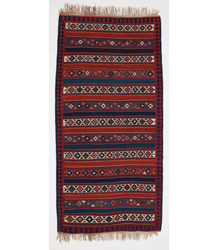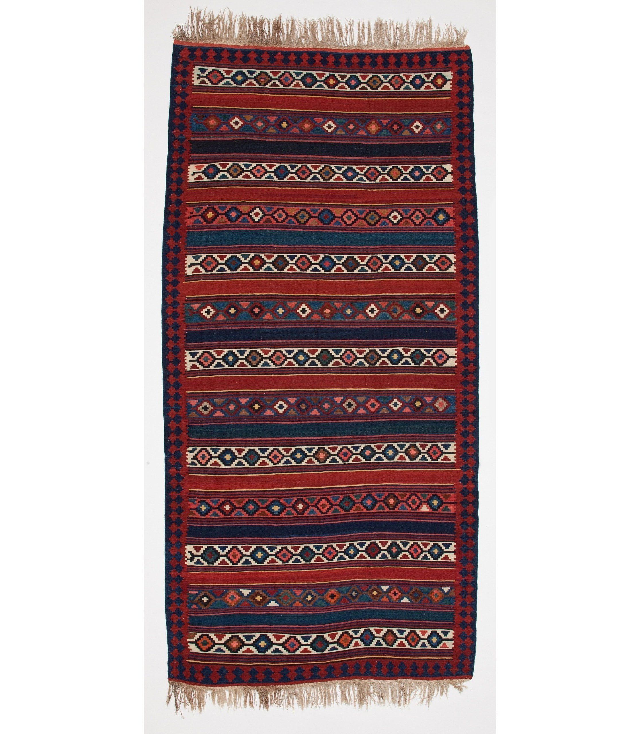 This vibrant flatweave rug measures approximately 5'8" x 11', making it a gallery runner perfect for a wide hallway or a galley kitchen. Hand selected by James for it's unique design and pristine condition, this one-of-a-kind antique is available for immediate delivery.