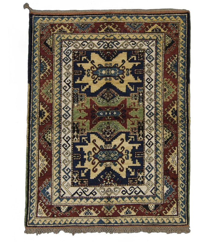 This Kazakh II rug is hand knotted of 100% Armenian wool and has a pile height around a third of an inch. This Kazakh II rug features three center medallions and makes use of latch hooks in the border design. The colors in this rug include royal blue, yellow, ruby red and light green with accents in ivory white, light green, steel blue and black.
