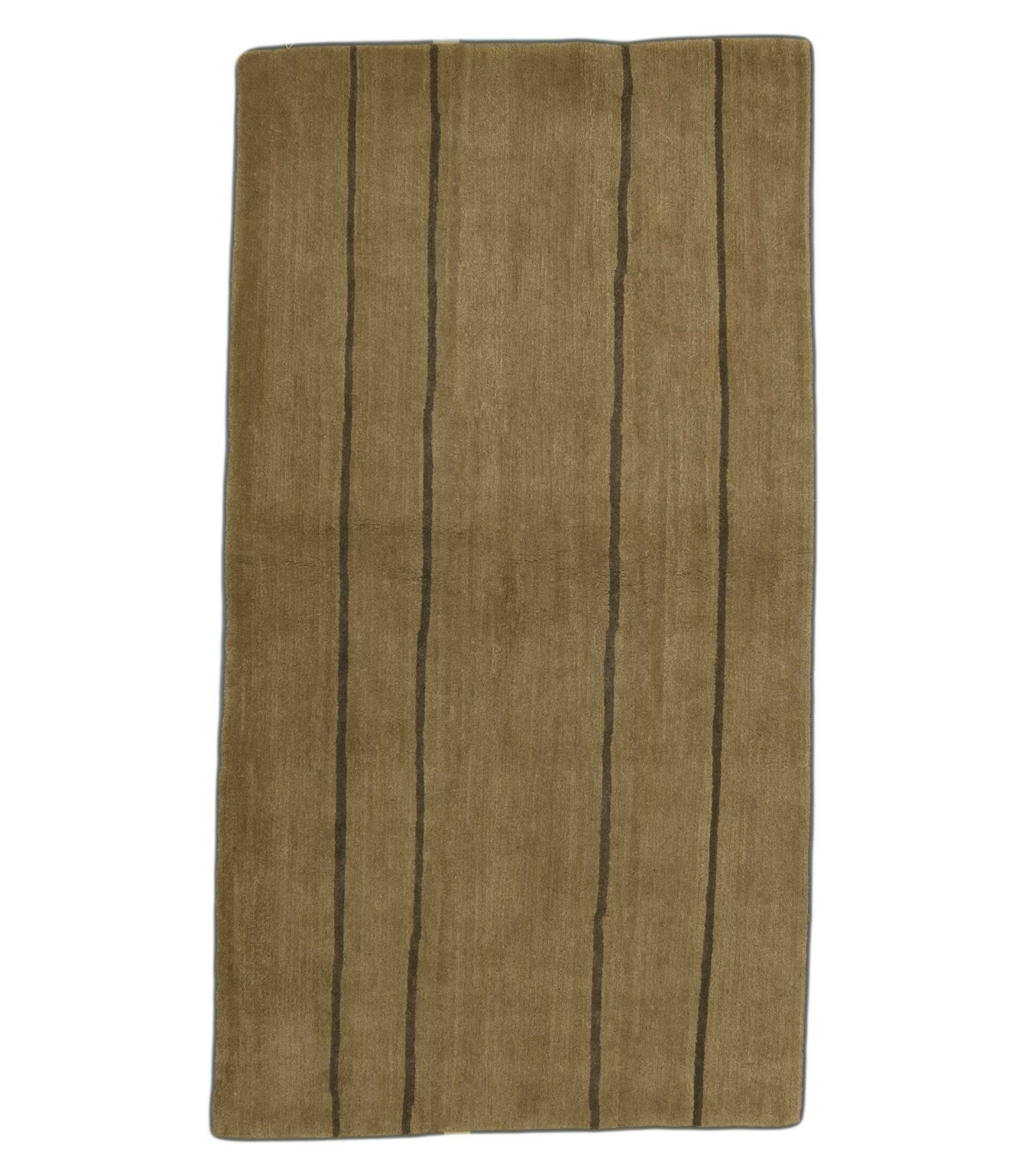 A unique Tibetan Lama weave handmade rug in beige. Mission Cornsilk w/Change is a one of a kind rug originally produced for a custom project and although it was not used for it's intended purpose it is a gorgeous rug and is ready to be used in your home. The design of this rug is loosely based on the programmed Mission Cornsilk rug, keeping the basic linear design elements which create a clean and versatile rug. The field of Mission Cornsilk w/Change is dark beige with chocolate brown accents. This rug was hand-knotted in Nepal of 100% Himalayan wool using our plush Lama weave which has an average pile height of 0.45 inches.