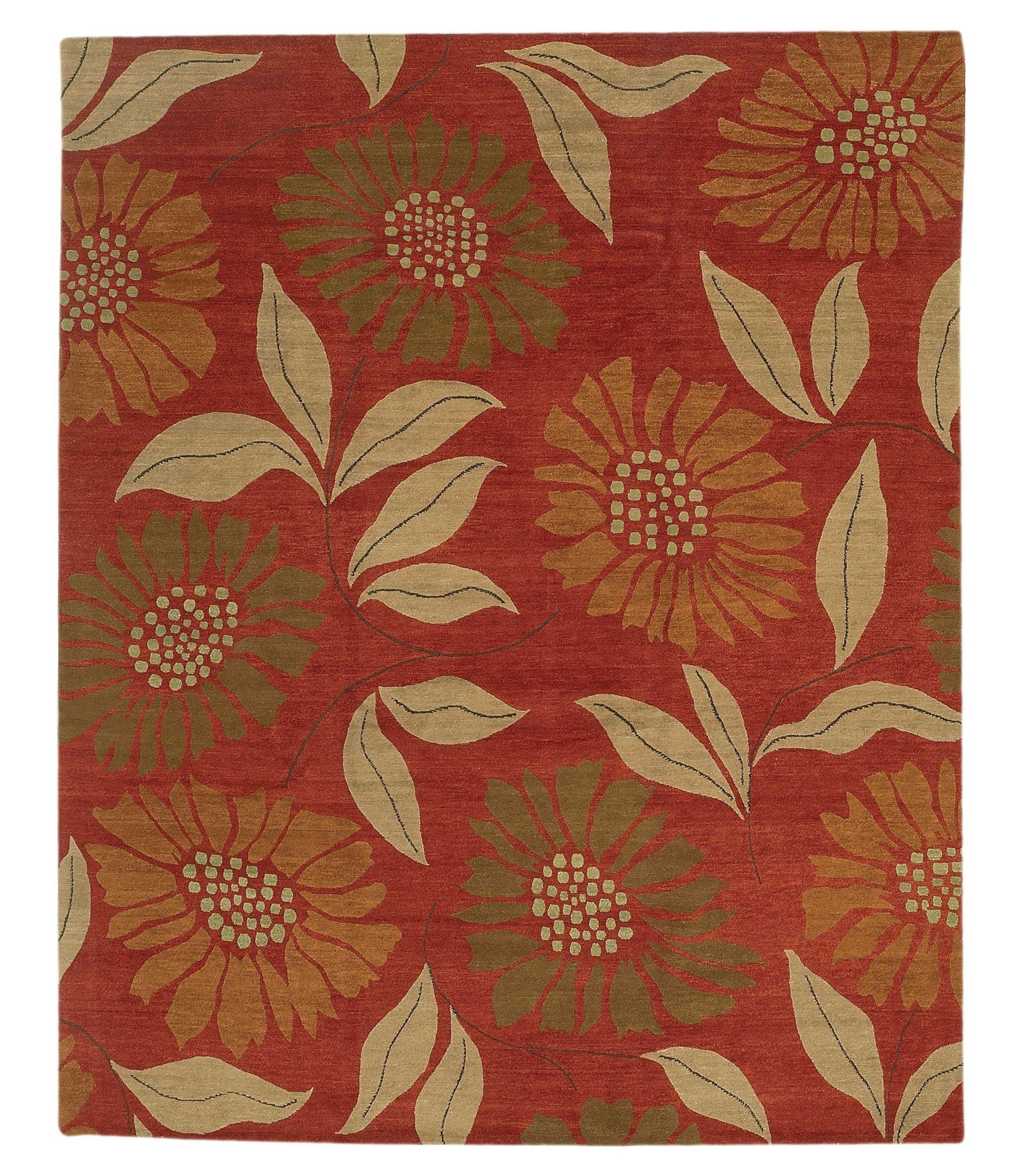 Whimsical petals strewn across the floor. A rug to make the furniture smile. Blossoming orange and grey flowers over a stunning ruby red field will enliven interiors.