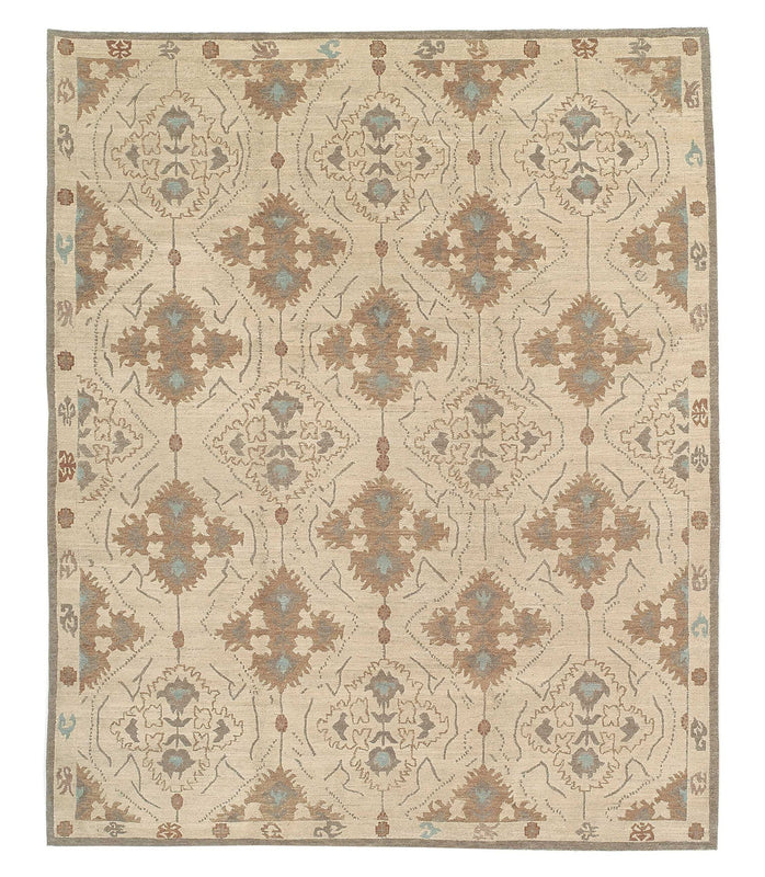 Taupe ethnic medallions with accents of light blue repeat on a sophisticated off white field of Himalayan wool. An exotic arts and crafts backdrop for any room.