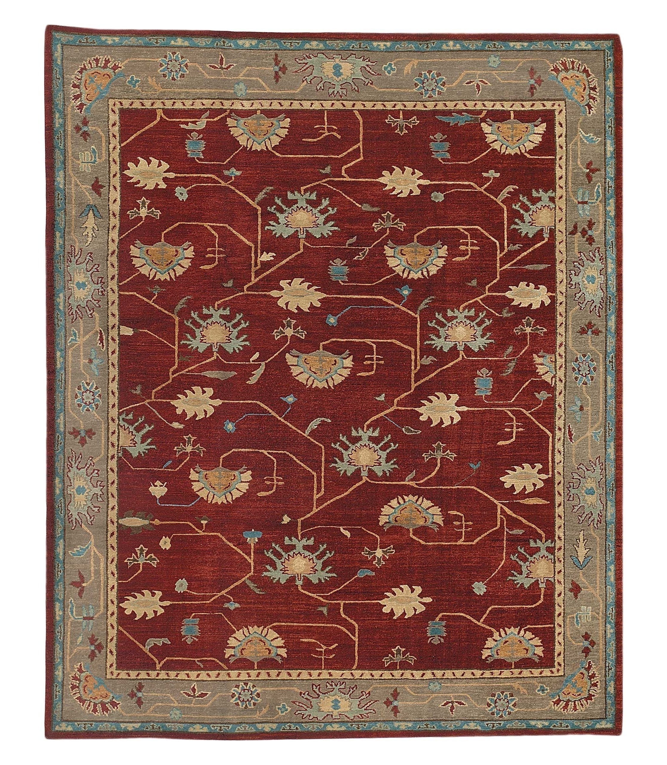 This glorious, bold red rug was made in Nepal with 100% Himalayan wool using our Kotana weave. The imagery of the pomegranate has a long and varied significance in the Middle East and the Orient including consideration as the original forbidden fruit of Paradise, symbolizing vitality, blood, life, the fertility of body and mind. The field color is a deep brick red, and the lyrical vines and artfully detailed flowers were crafted using slate grey, robins egg blue, pale blue, gold, beige, tan, and sage green.